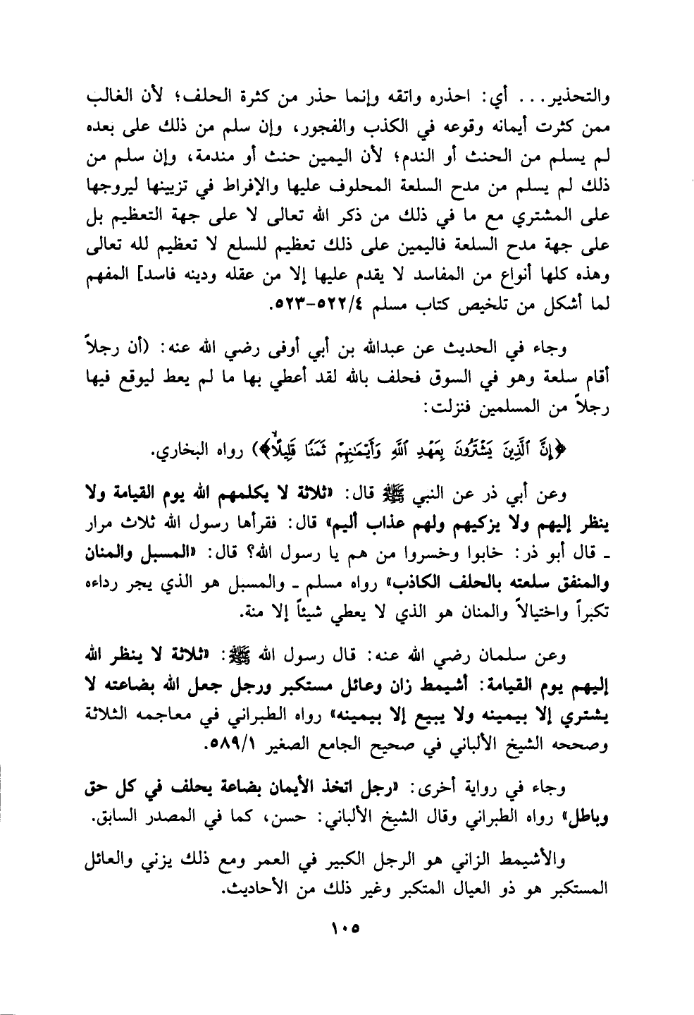 وعن سلمان - رضي الله عنه -: قال رسول الله - صلى الله عليه وسلم -: (ثلاثة لا ينظر الله إليهم يوم القيامة: أشيمط زان وعائل مستكبر ورجل جعل الله بضاعته لا يشتري إلا بيمينه ولا يبيع إلا بيمينه) رواه الطبراني في معاجمه الثلاثة وصححه الشيخ الألباني في صحيح الجامع الصغير 1/ 589.