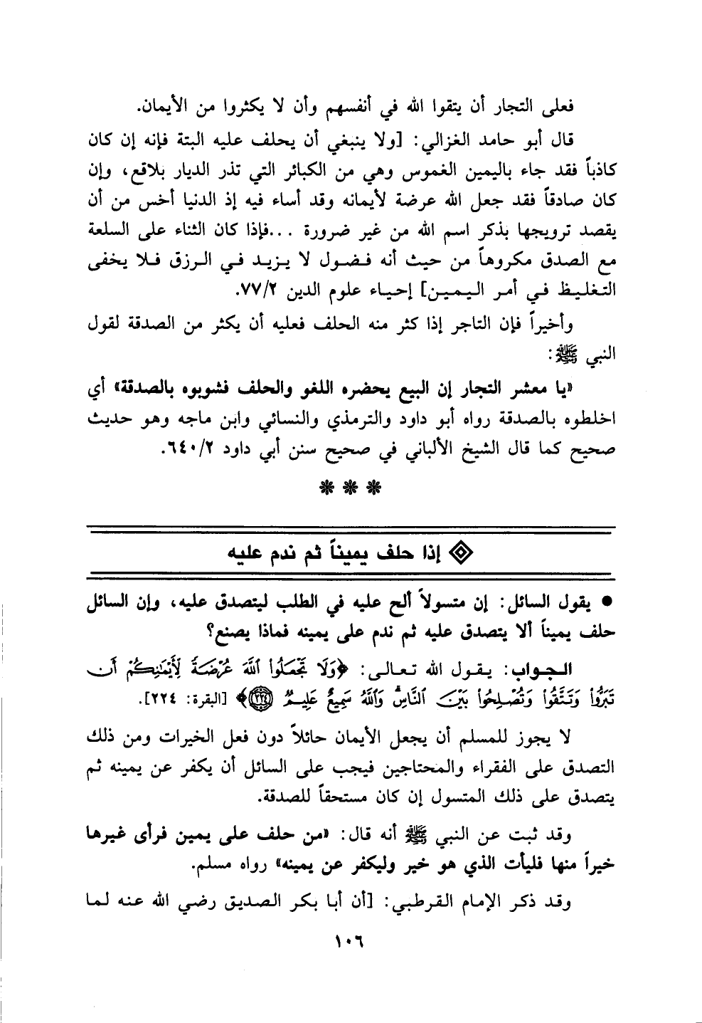وأخيراً فإن التاجر إذا كثر منه الحلف فعليه أن يكثر من الصدقة لقول النبي - صلى الله عليه وسلم -: (يا معشر التجار إن البيع يحضره اللغو والحلف فشوبوه بالصدقة) أي اخلطوه بالصدقة رواه أبو داود والترمذي والنسائي وابن ماجة وهو حديث صحيح كما قال الشيخ الألباني في صحيح سنن أبي داود 2/ 640.