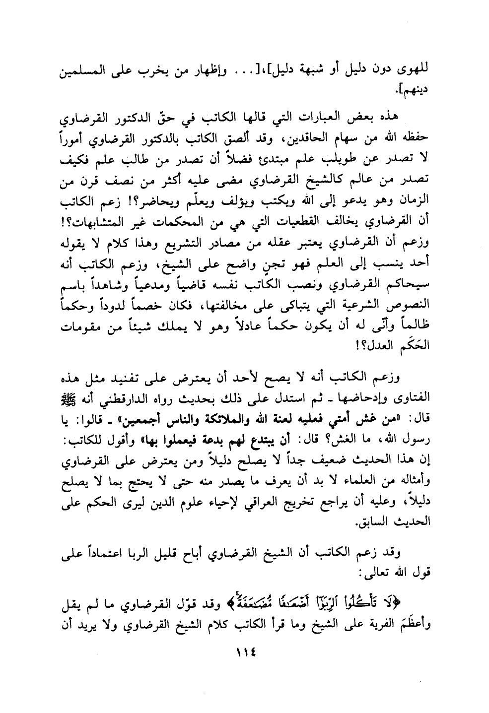 وقد زعم الكاتب أن الشيخ القرضاوي أباح قليل الربا اعتماداً على قول الله تعالى: