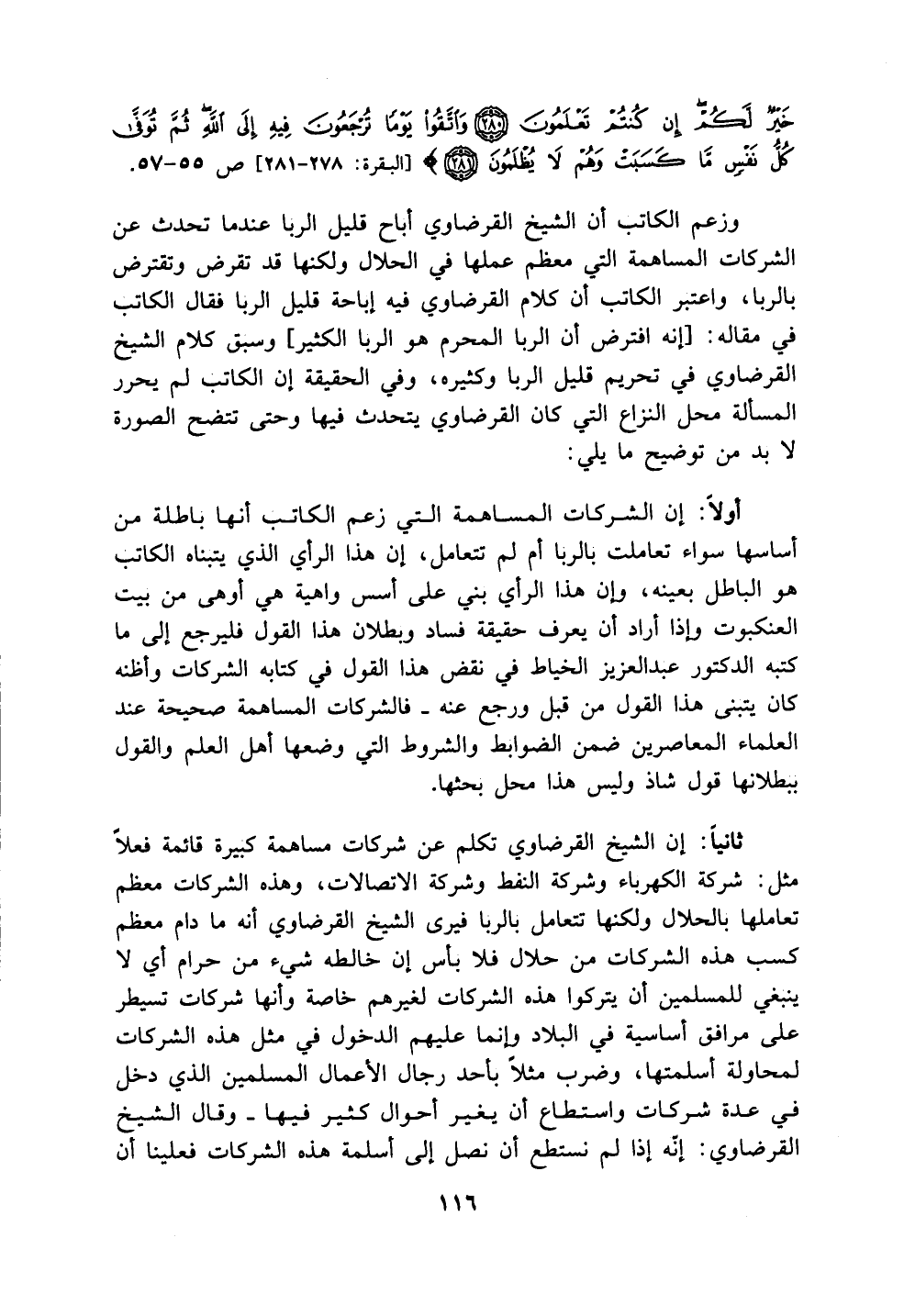 ثانياً: إن الشيخ القرضاوي تكلم عن شركات مساهمة كبيرة قائمة فعلاً مثل: شركة الكهرباء وشركة النفط وشركة الاتصالات، وهذه الشركات معظم تعاملها بالحلال ولكنها تتعامل بالربا فيرى الشيخ القرضاوي أنه ما دام معظم كسب هذه الشركات من حلال فلا بأس إن خالطه شيء من حرام أي لا ينبغي للمسلمين أن يتركوا هذه الشركات لغيرهم خاصة وأنها شركات تسيطر على مرافق أساسية في البلاد وإنما عليهم الدخول في مثل هذه الشركات لمحاولة أسلمتها، وضرب مثلاً بأحد رجال الأعمال المسلمين الذي دخل في عدة شركات واستطاع أن يغير أحوال كثير فيها. وقال الشيخ القرضاوي إنّه إذا لم نستطع أن نصل إلى أسلمة هذه الشركات فعلينا أن