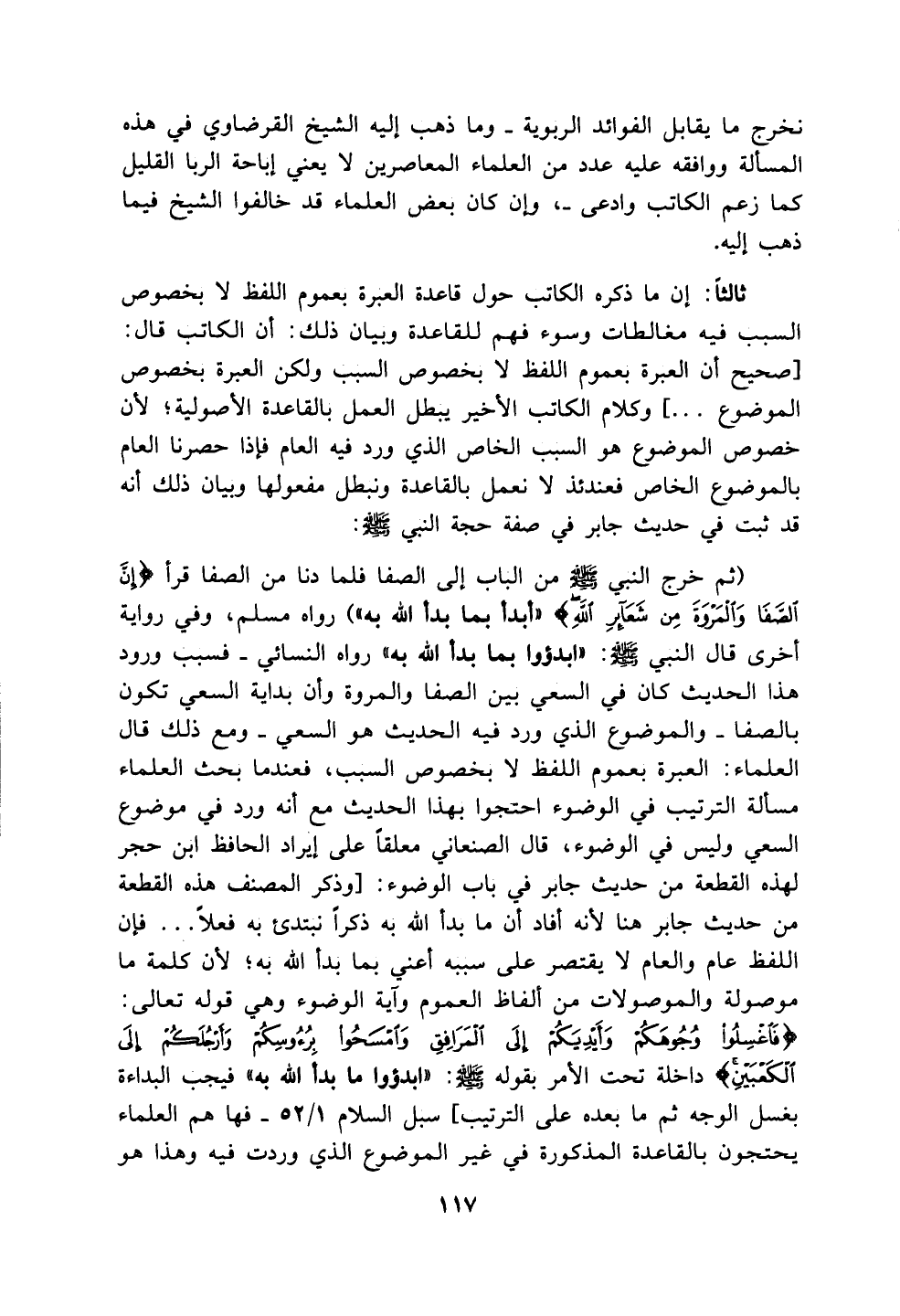 ثالثاً: إن ما ذكره الكاتب حول قاعدة العبرة بعموم اللفظ لا بخصوص السبب فيه مغالطات وسوء فهم للقاعدة وبيان ذلك: أن الكاتب قال: [صحيح أن العبرة بعموم اللفظ لا بخصوص السبب ولكن العبرة بخصوص الموضوع ... ] وكلام الكاتب الأخير يبطل العمل بالقاعدة الأصولية لأن خصوص الموضوع هو السبب الخاص الذي ورد فيه العام فإذا حصرنا العام بالموضوع الخاص فعنئذ لا نعمل بالقاعدة ونبطل مفعولها وبيان ذلك أنه قد ثبت في حديث جابر في صفة حجة النبي - صلى الله عليه وسلم -:
