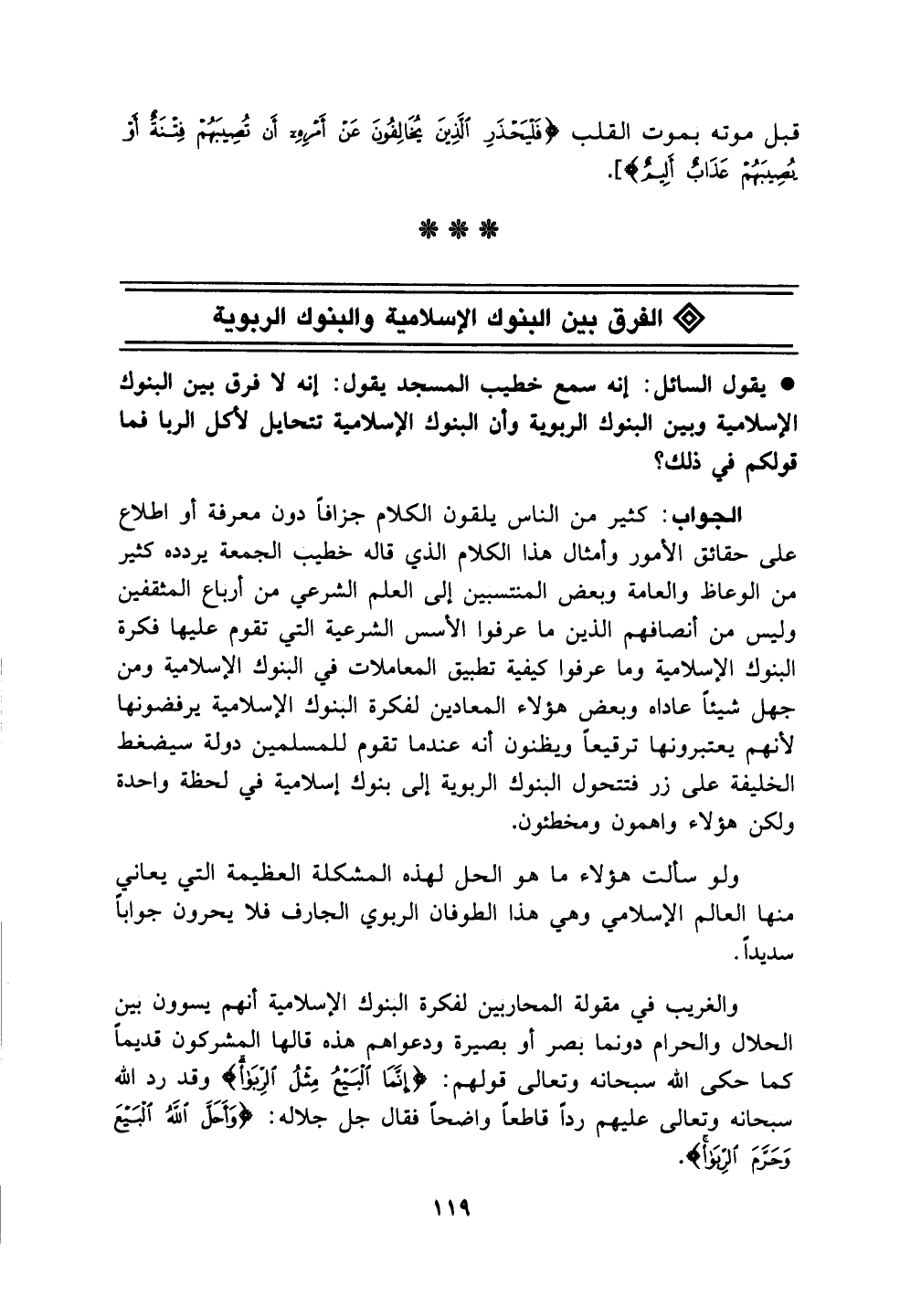 الجواب: كثير من الناس يلقون الكلام جزافاً دون معرفة أو اطلاع على حقائق الأمور وأمثال هذا الكلام الذي قاله خطيب الجمعة يردده كثير من الوعاظ والعامة وبعض المنتسبين إلى العلم الشرعي من أرباع المثقفين وليس من أنصافهم الذين ما عرفوا الأسس الشرعية التي تقوم عليها فكرة البنوك الإسلامية وما عرفوا كيفية تطبيق المعاملات في البنوك الإسلامية ومن جهل شيئاً عاداه وبعض هؤلاء المعادين لفكرة البنوك الإسلامية يرفضونها لأنهم يعتبرونها ترقيعاً ويظنون أنه عندما تقوم للمسلمين دولة سيضغط الخليفة على زر فتتحول البنوك الربوية إلى بنوك إسلامية في لحظة واحدة ولكن هؤلاء واهمون ومخطئون.