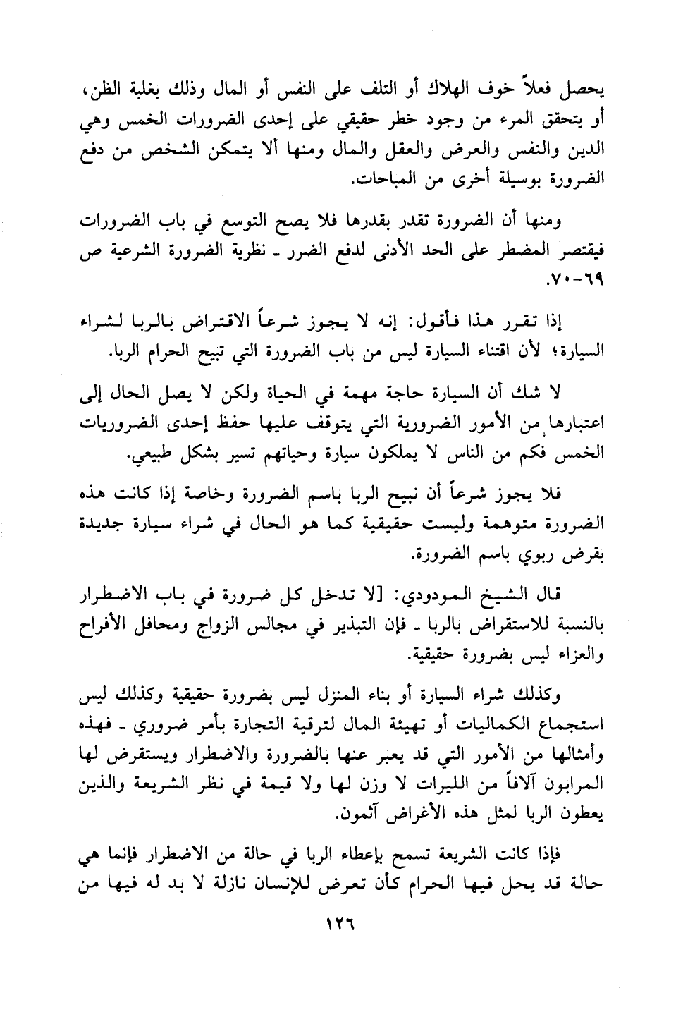 وكذلك شراء السيارة أو بناء المنزل ليس بضرورة حقيقية وكذلك ليس استجماع الكماليات أو تهيئة المال لترقية التجارة بأمر ضروري. فهذه وأمثالها من الأمور التي قد يعبر عنها بالضرورة والاضطرار ويستقرض لها المرابون آلافاً من الليرات لا وزن لها ولا قيمة في نظر الشريعة والذين يعطون الربا لمثل هذه الأغراض آثمون.