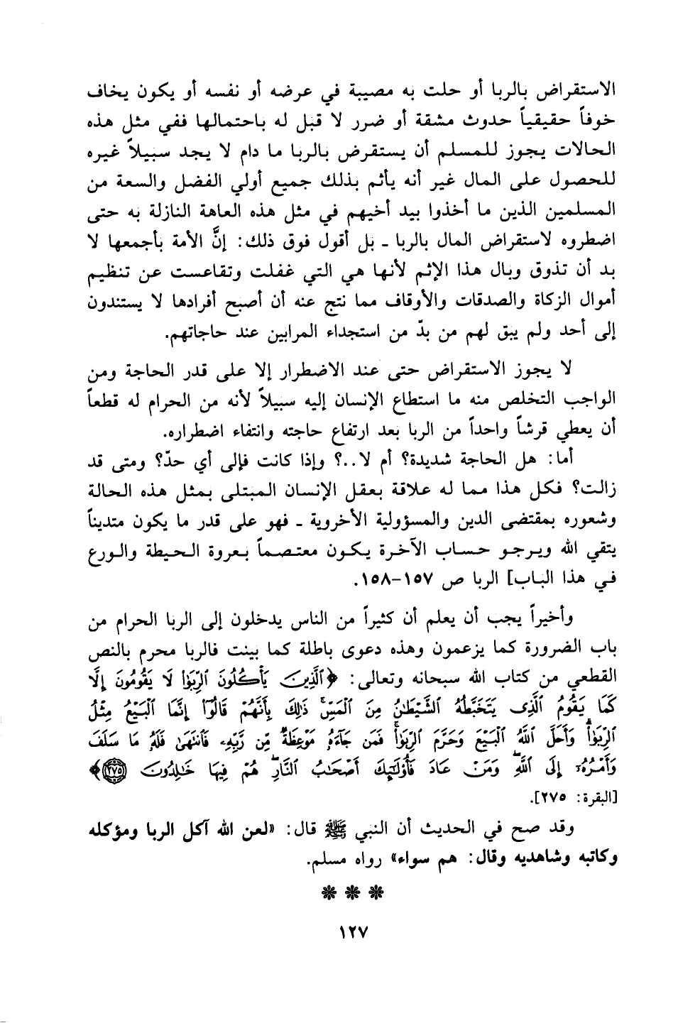 الاستقراض بالربا أو حلت به مصيبة في عرضه أو نفسه أو يكون يخاف خوفاً حقيقياً حدوث مشقة أو ضرر لا قبل له باحتمالها ففي مثل هذه الحالات يجوز للمسلم أن يستقرض بالربا ما دام لا يجد سبيلاً غيره للحصول على المال غير أنه يأثم بذلك جميع أولي الفضل والسعة من المسلمين الذين ما أخذوا بيد أخيهم في مثل هذه العاهة النازلة به حتى اضطروه لاستقراض المال بالربا. بل أقول فوق ذلك أن الأمة بأجمعها لا بد أن تذوق وبال هذا الإثم لأنها هي التي غفلت وتقاعست عن تنظيم أموال الزكاة والصدقات والأوقاف مما نتج عنه أن أصبح أفرادها لا يستندون إلى أحد ولم يبق لهم من بدّ من استجداء المرابين عند حاجاتهم.