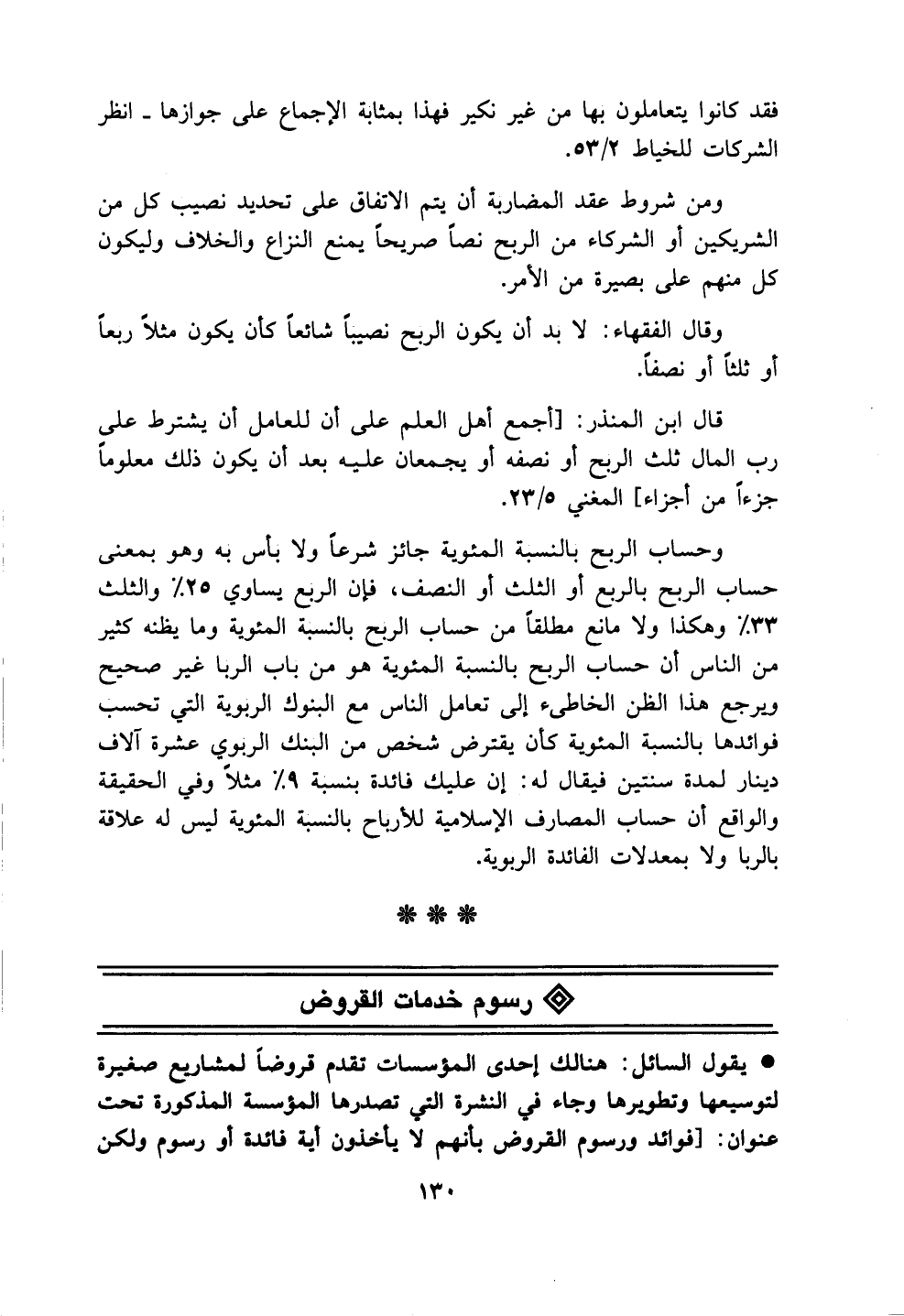 وحساب الربح بالنسبة المئوية جائز شرعاً ولا بأس به وهو بمعنى حساب الربح بالربع أو الثلث أو النصف، فإن الربع يساوي 25% والثلث 33% وهكذا ولا مانع مطلقاً من حساب الربح بالنسبة المئوية وما يظنه كثير من الناس أن حساب الربح بالنسبة المئوية هو من باب الربا غير صحيح ويرجع هذا الظن الخاطىء إلى تعامل الناس مع البنوك الربوية التي تحسب فوائدها بالنسبة المئوية كأن يقترض شخص من البنك الربوي عشرة آلاف دينار لمدة سنتين فيقال له إن عليك فائدة بنسبة 9% مثلاً وفي الحقيقة والواقع أن حساب المصارف الإسلامية للأرباح بالنسبة المئوية ليس له علاقة بالربا ولا بمعدلات الفائدة الربوية.