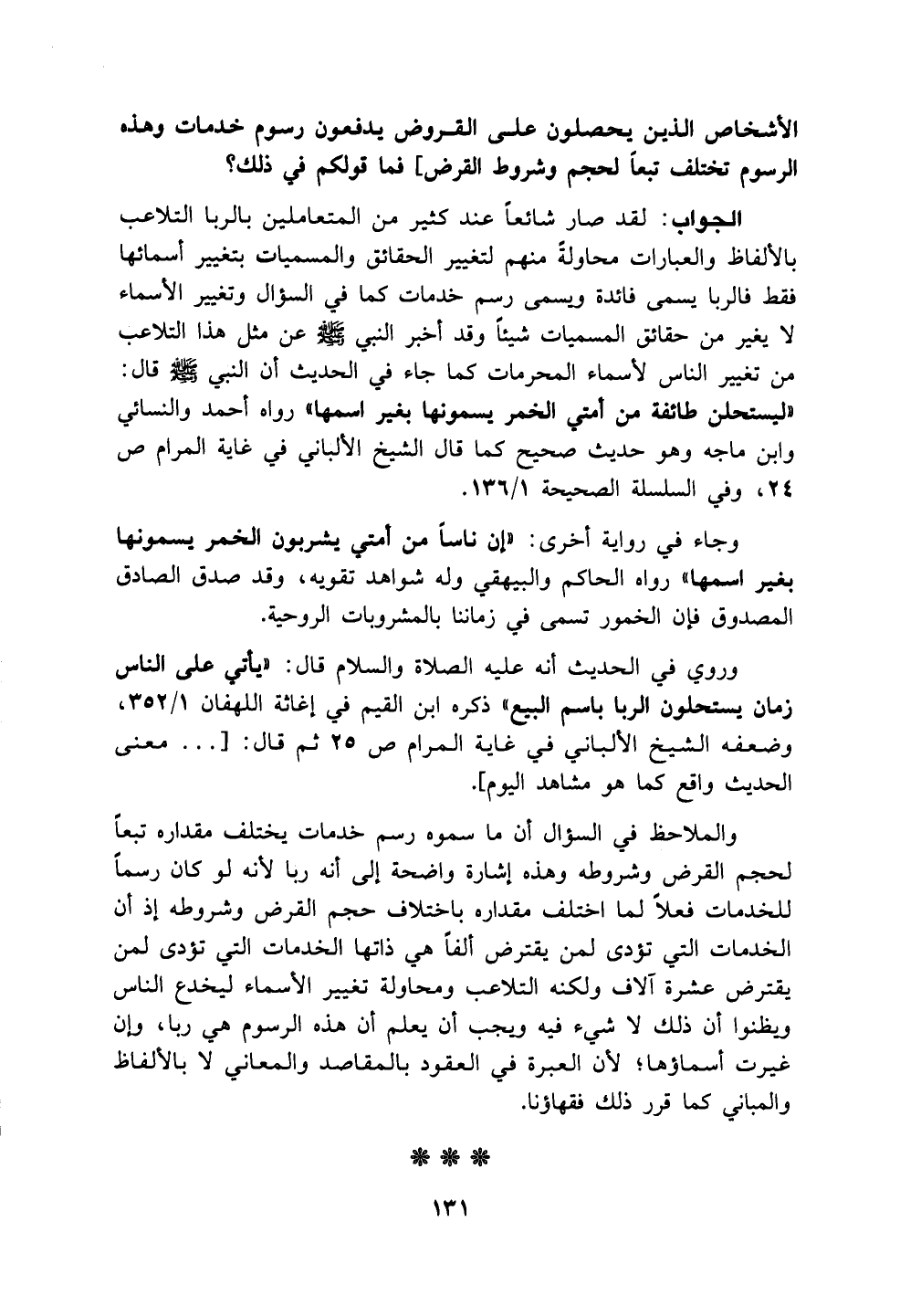 الجواب: لقد صار شائعاً عند كثير من المتعاملين بالربا التلاعب بالألفاظ والعبارات محاولةً منهم لتغيير الحقائق والمسميات بتغيير أسمائها فقط فالربا يسمى فائدة ويسمى رسم خدمات كما في السؤال وتغيير الأسماء لا يغير من حقائق المسميات شيئاً وقد أخبر النبي - صلى الله عليه وسلم - عن مثل هذا التلاعب من تغيير الناس لأسماء المحرمات كما جاء في الحديث أن النبي - صلى الله عليه وسلم - قال: (ليستحلن طائفة من أمتي الخمر يسمونها بغير اسمها) رواه أحمد والنسائي وابن ماجة وهو حديث صحيح كما قال الشيخ الألباني في غاية المرام ص 24، وفي السلسلة الصحيحة 1/ 136.