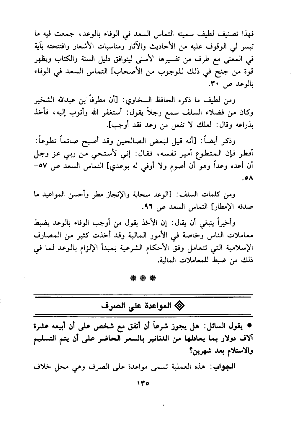 وذكر أيضاً: [أنه قيل لبعض الصالحين وقد أصبح صائماً تطوعاً: أفطر فإن المتطوع أمير نفسه. فقال: إني لأستحي من ربي عز وجل أن أعده وعداً وهو أن أصوم ولا أوفي له بوعدي] التماس السعد ص 57 - 58.