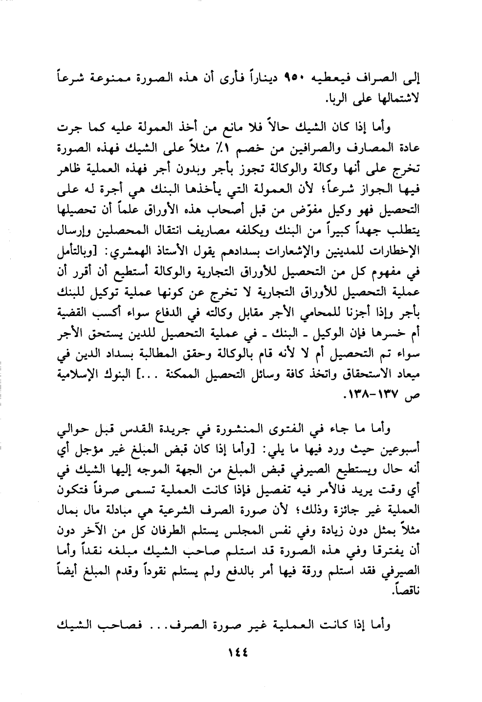 وأما ما جاء في الفتوى المنشورة في جريدة القدس قبل حوالي أسبوعين حيث ورد فيها ما يلي: [وأما إذا كان قبض المبلغ غير مؤجل أي أنه حال ويستطيع الصيرفي قبض المبلغ من الجهة الموجه إليها الشيك في أي وقت يريد فالأمر فيه تفصيل فإذا كانت العملية تسمى صرفاً فتكون العملية غير جائزة وذلك لأن صورة الصرف الشرعية هي مبادلة مال بمال مثلاً بمثل دون زيادة وفي نفس المجلس يستلم الطرفان كل من الآخر دون أن يفترقا وفي هذه الصورة قد استلم صاحب الشيك مبلغه نقداً وأما الصيرفي فقد استلم ورقة فيها أمر بالدفع ولم يستلم نقوداً وقدم المبلغ أيضاً ناقصاً.