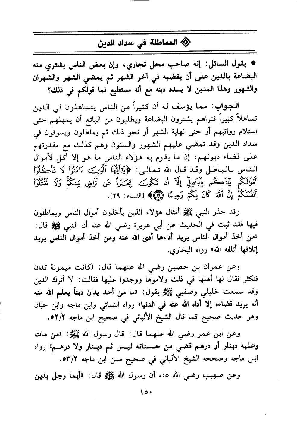 الجواب: مما يؤسف له أن كثيراً من الناس يتساهلون في الدين تساهلاً كبيراً فتراهم يشترون البضاعة ويطلبون من البائع أن يمهلهم حتى استلام رواتبهم أو حتى نهاية الشهر أو نحو ذلك ثم يماطلون ويسوفون في سداد الدين وقد تمضي عليهم الشهور والسنون وهم كذلك مع مقدرتهم على قضاء ديونهم، إن ما يقوم به هؤلاء الناس ما هو إلا أكل لأموال الناس بالباطل وقد قال الله تعالى: (يَا أَيُّهَا الَّذِينَءَامَنُوا لَا تَأْكُلُوا أَمْوَالَكُمْ بَيْنَكُمْ بِالْبَاطِلِ إِلَّا أَنْ تَكُونَ تِجَارَةً عَنْ تَرَاضٍ مِنْكُمْ وَلَا تَقْتُلُوا أَنْفُسَكُمْ إِنَّ اللَّهَ كَانَ بِكُمْ رَحِيمًا) سورة النساء الآية 29.