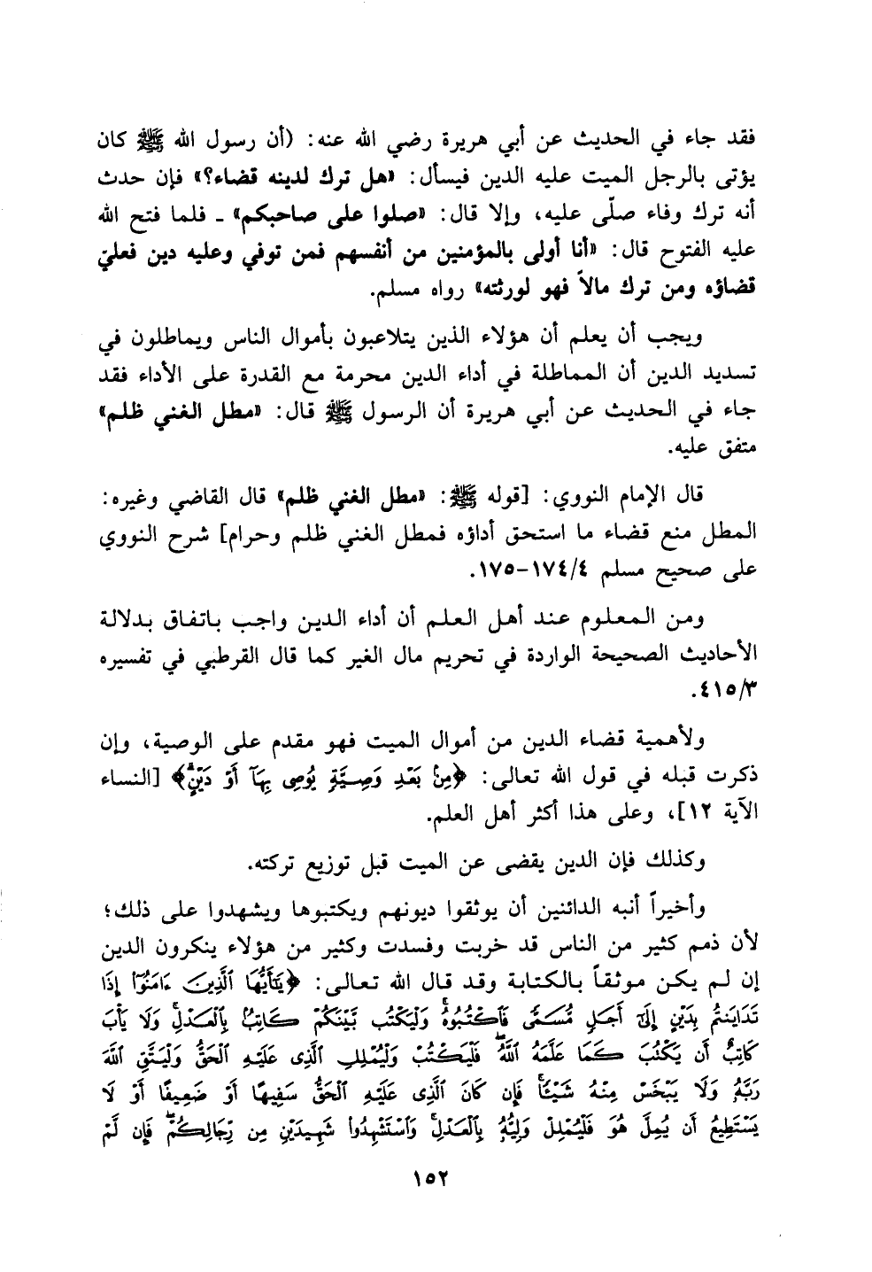 ومن المعلوم عند أهل العلم أن أداء الدين واجب باتفاق بدلالة الأحاديث الصحيحة الواردة في تحريم مال الغير كما قال القرطبي في تفسيره 3/ 415.