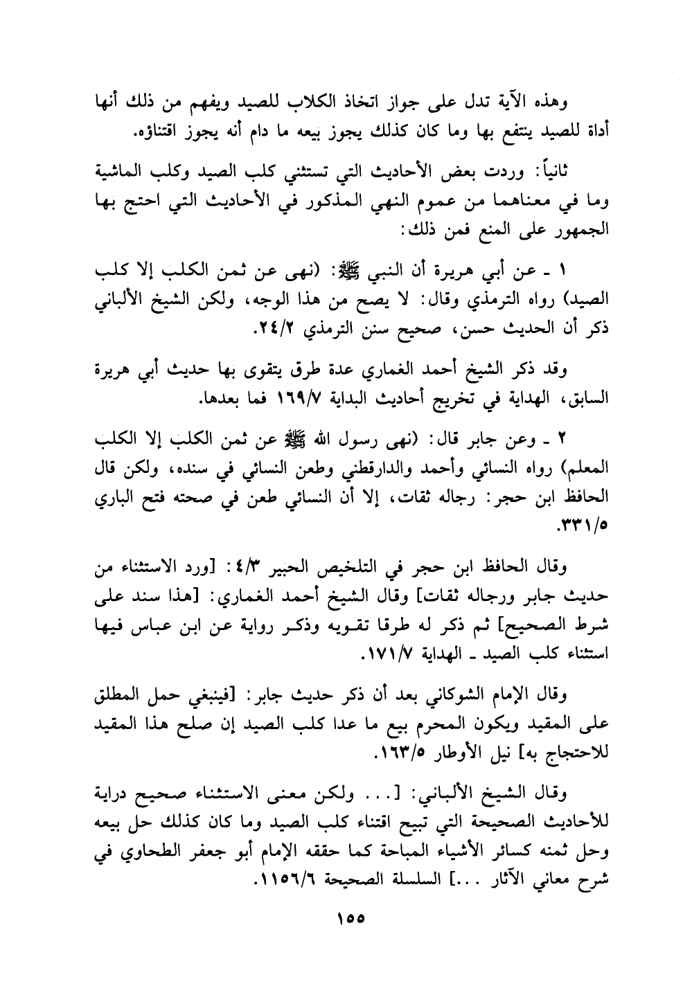 وقال الشيخ الألباني: [ ... ولكن معنى الاستثناء صحيح دراية للأحاديث الصحيحة التي تبيح اقتناء كلب الصيد وما كان كذلك حل بيعه وحل ثمنه كسائر الأشياء المباحة كما حققه الإمام أبو جعفر الطحاوي في شرح معاني الآثار ... ] السلسلة الصحيحة 6/ 1156.