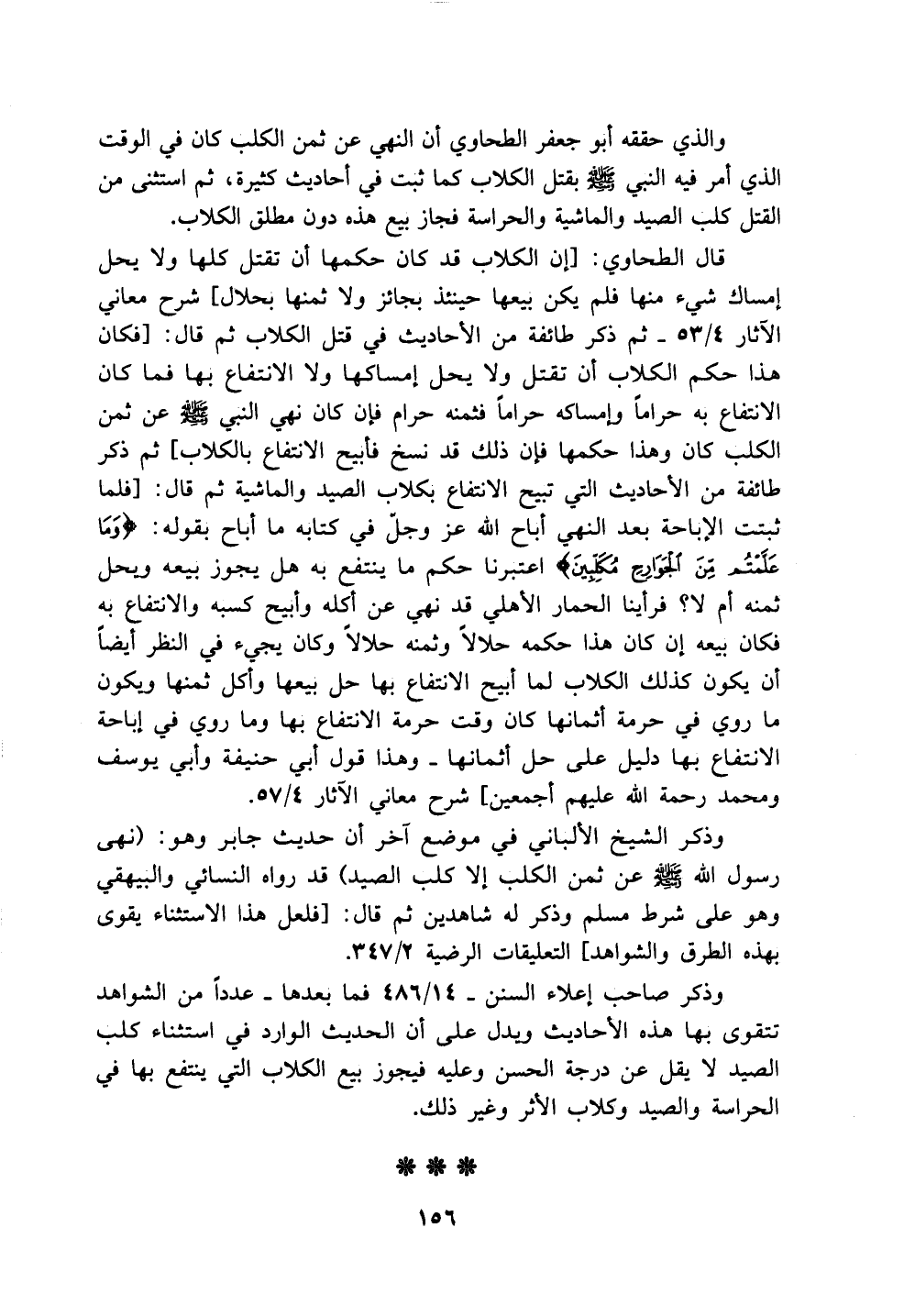 قال الطحاوي: [إن الكلاب قد كان حكمها أن تقتل كلها ولا يحل إمساك شيء منها فلم يكن بيعها حينئذ بجائز ولا ثمنها بحلال] شرح معاني الآثار 4/ 53. ثم ذكر طائفة من الأحاديث في قتل الكلاب ثم قال: [فكان هذا حكم الكلاب أن تقتل ولا يحل إمساكها ولا الانتفاع بها فما كان الانتفاع به حراماً وإمساكه حراماً فثمنه حرام فإن كان نهي النبي - صلى الله عليه وسلم - عن ثمن الكلب كان وهذا حكمها فإن ذلك قد نسخ فأبيح الانتفاع بالكلاب] ثم ذكر طائفة من الأحاديث التي تبيح الانتفاع بكلاب الصيد والماشية ثم قال: [فلما ثبتت الإباحة بعد النهي أباح الله عز وجلّ في كتابه ما أباح بقوله: (وَمَا عَلَّمْتُمْ مِنَ الْجَوَارِحِ مُكَلِّبِينَ) اعتبرنا حكم ما ينتفع به هل يجوز بيعه ويحل ثمنه أم لا؟ فرأينا الحمار الأهلي قد نهي عن أكله وأبيح كسبه والانتفاع به فكان بيعه إن كان هذا حكمه حلالاً وثمنه حلالاً وكان يجيء في النظرأيضاً أن يكون كذلك الكلاب لما أبيح الانتفاع بها حل بيعها وأكل ثمنها ويكون ما روي في حرمة أثمانها كان وقت حرمة الانتفاع بها وما روي في إباحة الانتفاع بها دليل على حل أثمانها. وهذا قول أبي حنيفة وأبي يوسف ومحمد رحمة الله عليهم أجمعين] شرح معاني الآثار 4/ 57.