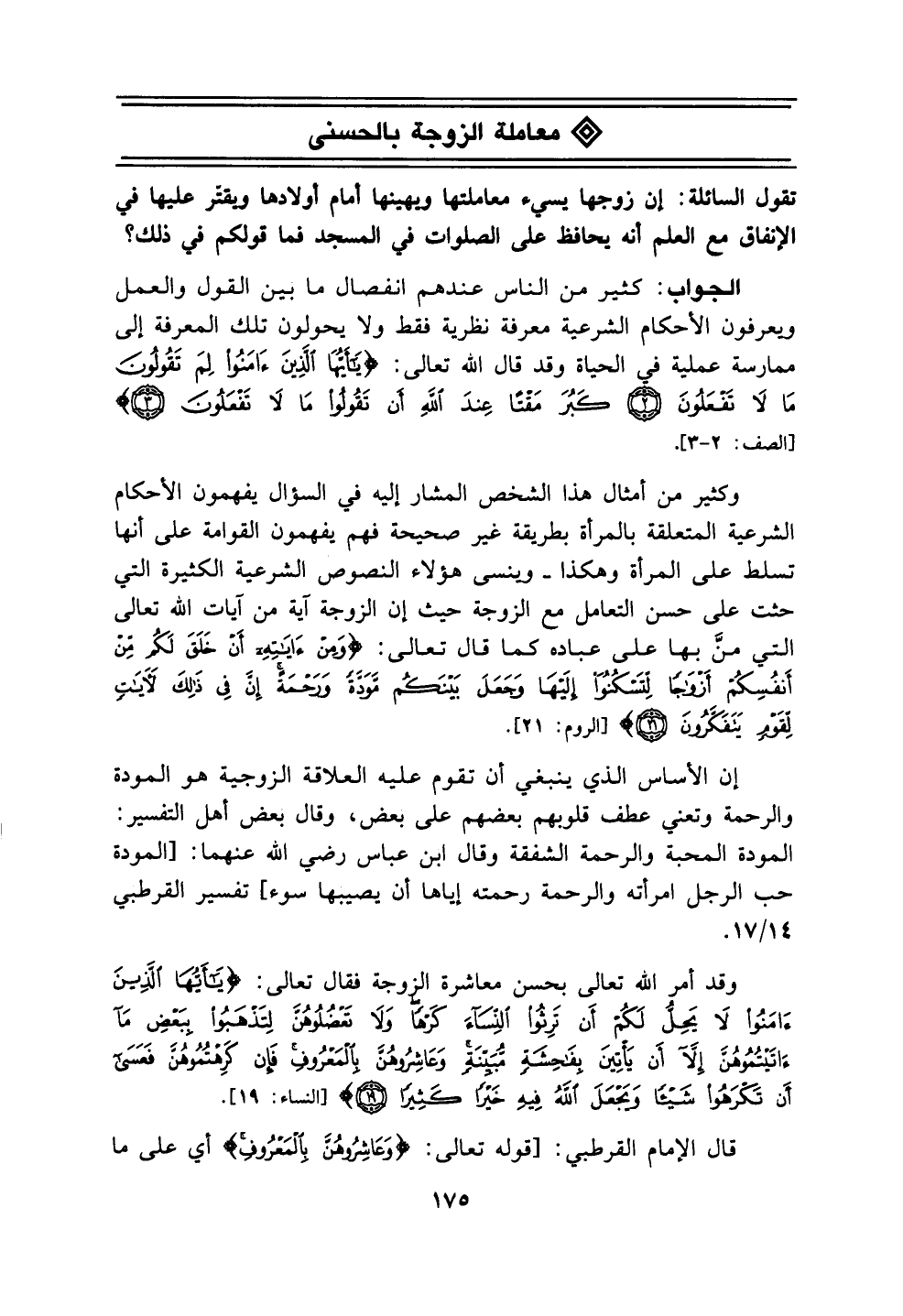 قال الإمام القرطبي: [قوله تعالى: (وَعَاشِرُوهُنَّ بِالْمَعْرُوفِ) أي على ما