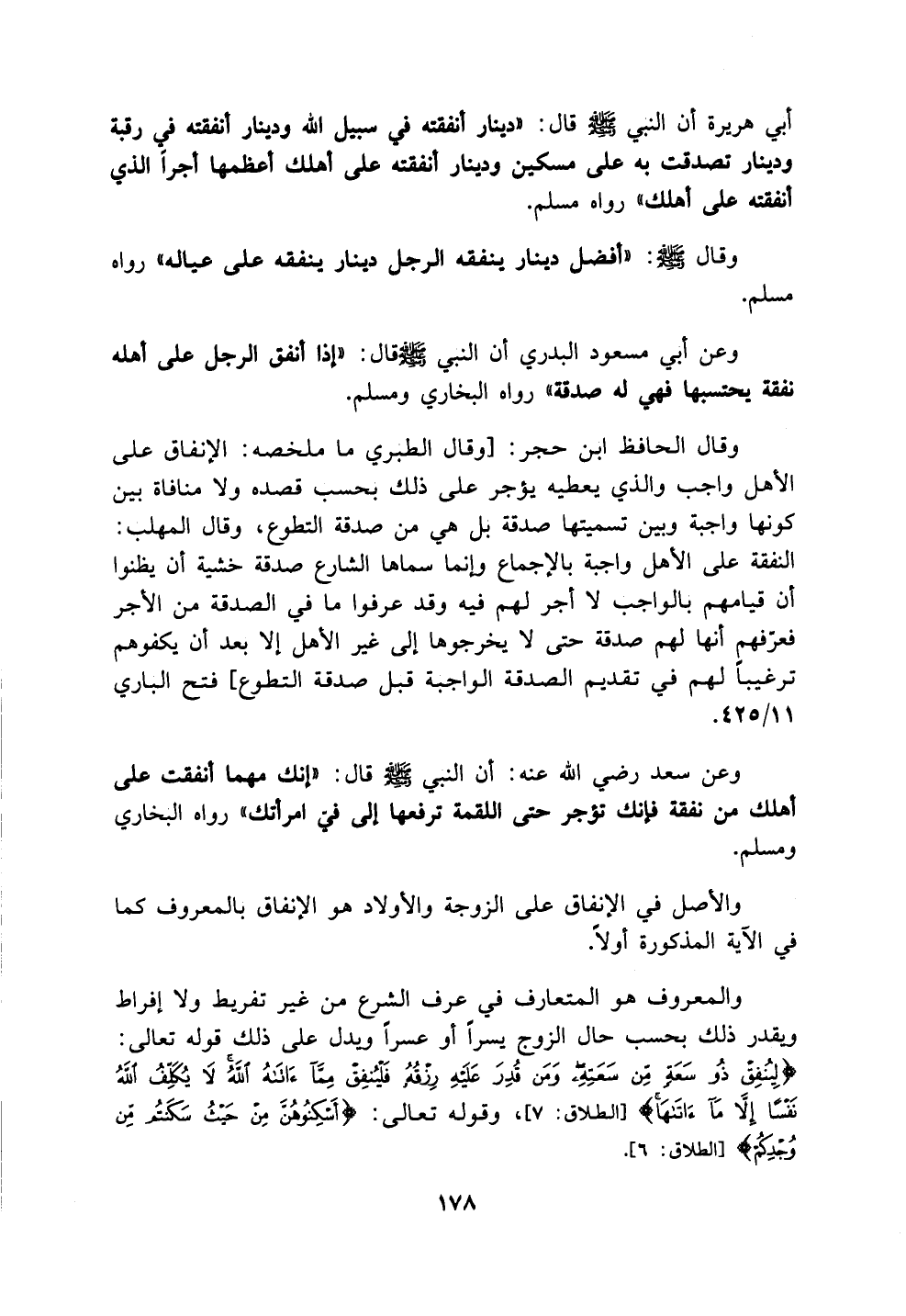أبي هريرة أن النبي - صلى الله عليه وسلم - قال: (دينار أنفقته في سبيل الله ودينار أنفقته في رقبة ودينار تصدقت به على مسكين ودينار أنفقته على أهلك أعظمها أجراً الذي أنفقته على أهلك) رواه مسلم.