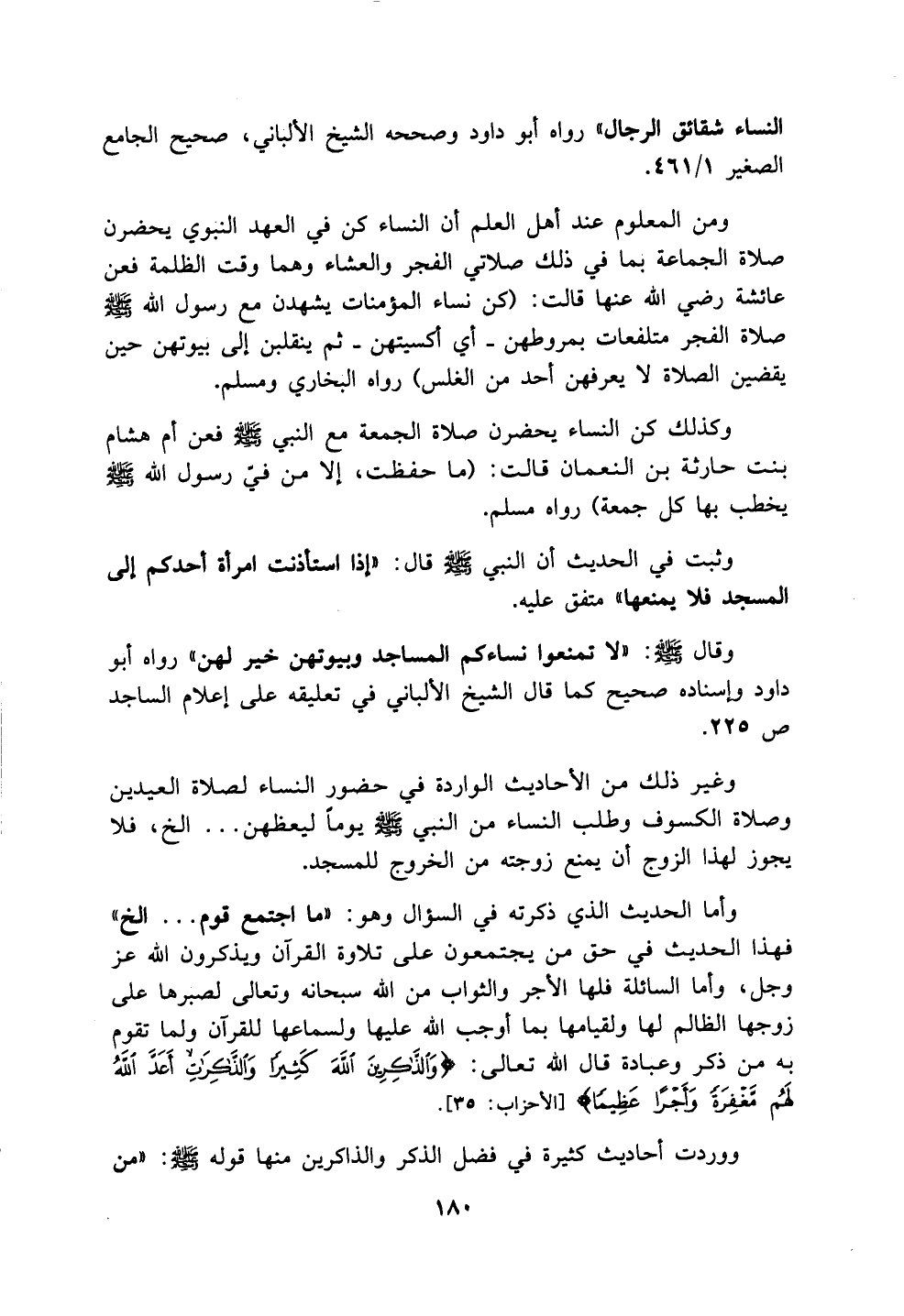 وقال - صلى الله عليه وسلم -: (لا تمنعوا نساءكم المساجد وبيوتهن خير لهن) رواه أبو داود وإسناده صحيح كما قال الشيخ الألباني في تعليقه على إعلام الساجد ص 225.