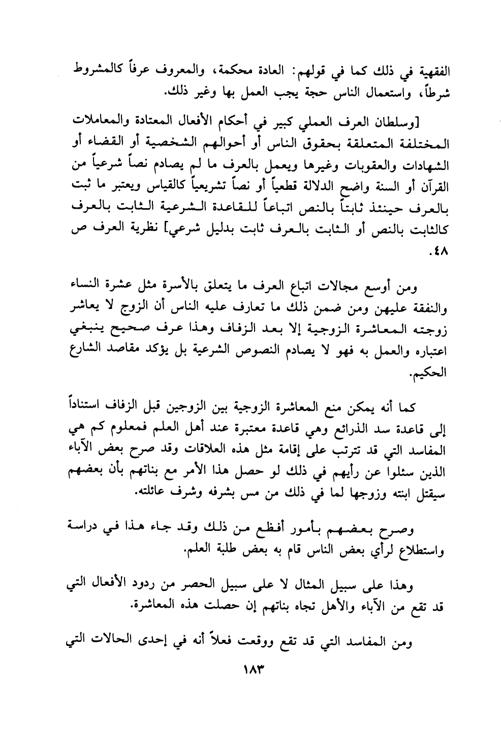 [وسلطان العرف العملي كبير في أحكام الأفعال المعتادة والمعاملات المختلفة المتعلقة بحقوق الناس أو أحوالهم الشخصية أو القضاء أو الشهادات والعقوبات وغيرها ويعمل بالعرف ما لم يصادم نصاً شرعياً من القرآن أو السنة واضح الدلالة قطعياً أو نصاً تشريعياً كالقياس ويعتبر ما ثبت بالعرف حينئذ ثابتاً بالنص اتباعاً للقاعدة الشرعية الثابت بالعرف كالثابت بالنص أو الثابت بالعرف ثابت بدليل شرعي] نظرية العرف ص 48.