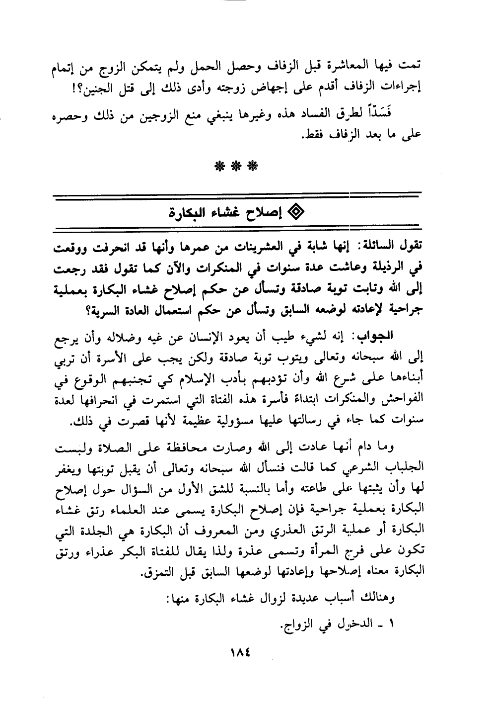 وما دام أنها عادت إلى الله وصارت محافظة على الصلاة ولبست الجلباب الشرعي كما قالت فنسأل الله سبحانه وتعالى أن يقبل توبتها ويغفر لها وأن يثبتها على طاعته وأما بالنسبة للشق الأول من السؤال حول إصلاح البكارة بعملية جراحية فإن إصلاح البكارة يسمى عند العلماء رتق غشاء البكارة أو عملية الرتق العذري ومن المعروف أن البكارة هي الجلدة التي تكون على فرج المرأة وتسمى عذرة ولذا يقال للفتاة البكر عذراء ورتق البكارة معناه إصلاحها وإعادتها لوضعها السابق قبل التمزق.