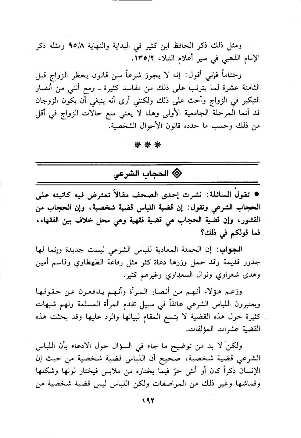 وختاماً فإني أقول إنه لا يجوز شرعاً سن قانون يحظر الزواج قبل الثامنة عشرة لما يترتب على ذلك من مفاسد كثيرة. ومع أنني من أنصار التبكير في الزواج وأحث على ذلك ولكنني أرى أنه ينبغي أن يكون الزوجان قد أتما المرحلة الجامعية الأولى وهذا لا يعني منع حالات الزواج في أقل من ذلك وحسب ما حدده قانون الأحوال الشخصية.