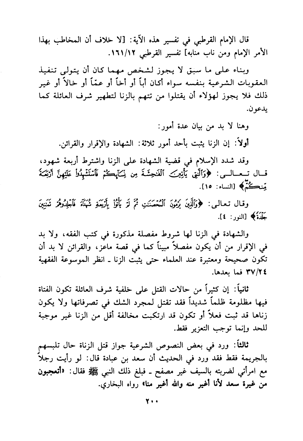 وبناء على ما سبق لا يجوز لشخص مهما كان أن يتولى تنفيذ العقوبات الشرعية بنفسه سواء أكان أباً أو أخاً أو عمّاً أو خالاً أو غير ذلك فلا يجوز لهؤلاء أن يقتلوا من تتهم بالزنا لتطهير شرف العائلة كما يدعون.