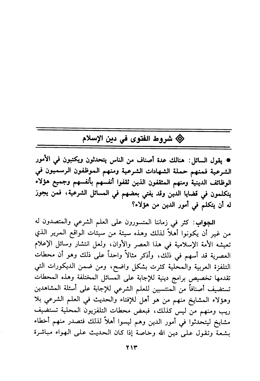 يقول السائل: هنالك عدة أصناف من الناس يتحدثون ويكتبون في الأمور الشرعية فمنهم حملة الشهادات الشرعية ومنهم الموظفون الرسميون في الوظائف الدينية ومنهم المثقفون الذين ثقفوا أنفسهم بأنفسهم وجميع هؤلاء يتكلمون في قضايا الدين وقد يفتي بعضهم في المسائل الشرعية، فمن يجوز له أن يتكلم في أمور الدين من هؤلاء؟