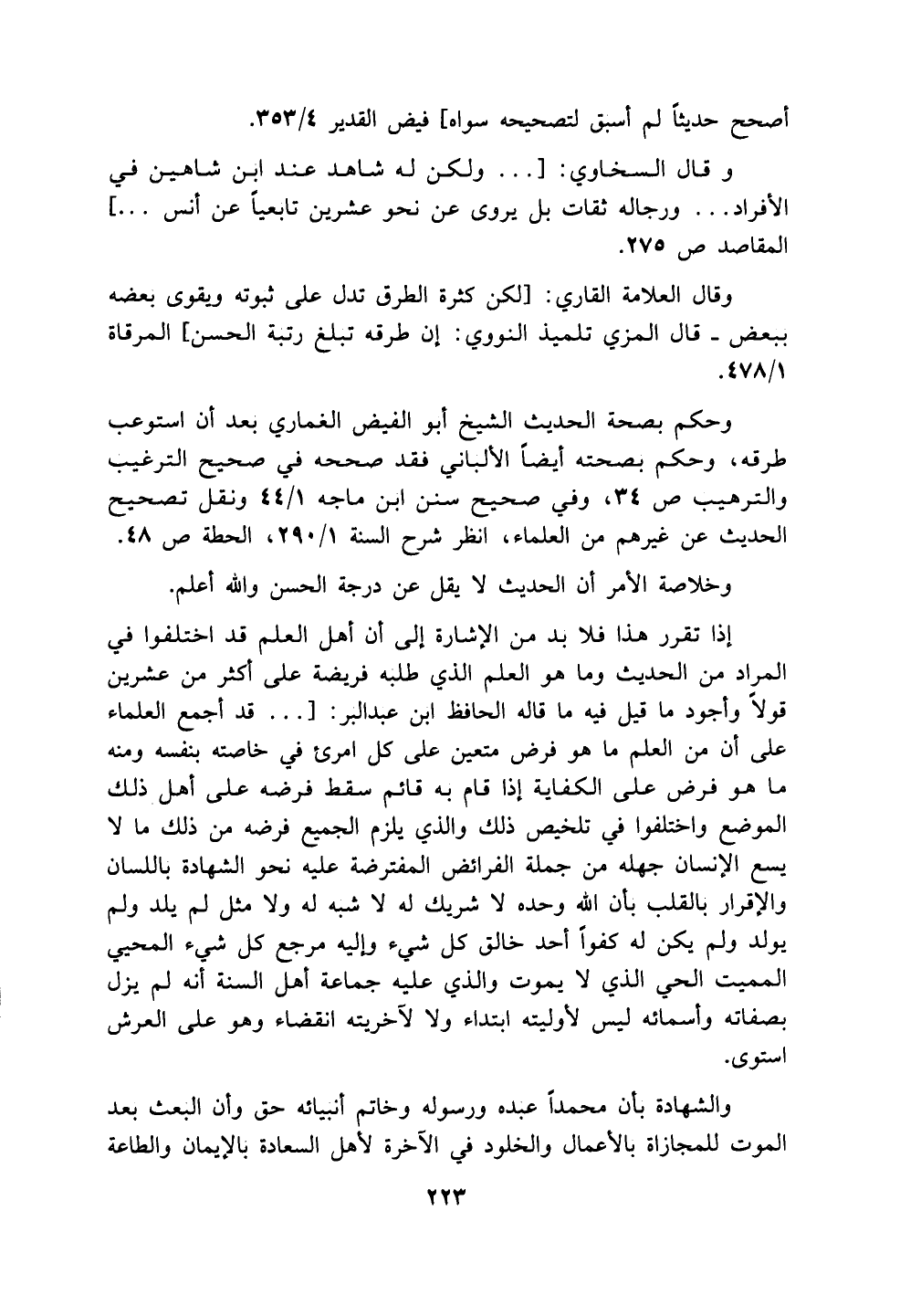 إذا تقرر هذا فلا بد من الإشارة إلى أن أهل العلم قد اختلفوا في المراد من الحديث وما هو العلم الذي طلبه فريضة على أكثر من عشرين قولاً وأجود ما قيل فيه ما قاله الحافظ ابن عبد البر: [ ... قد أجمع العلماء على أن من العلم ما هو فرض متعين على كل امرئ في خاصته بنفسه ومنه ما هو فرض على الكفاية إذا قام به قائم سقط فرضه على أهل ذلك الموضع واختلفوا في تلخيص ذلك والذي يلزم الجميع فرضه من ذلك ما لا يسع الإنسان جهله من جملة الفرائض المفترضة عليه نحو الشهادة باللسان والإقرار باللقب بأن الله وحده لا شريك له لا شبه له ولا مثل لم يلد ولم يولد ولم يكن له كفواً أحد خالق كل شيء وإليه مرجع كل شيء المحيي المميت الحي الذي لا يموت والذي عليه جماعة أهل السنة أنه لم يزل بصفاته وأسمائه ليس لأوليته ابتداء ولا لآخريته انقضاء وهو على العرش استوى.