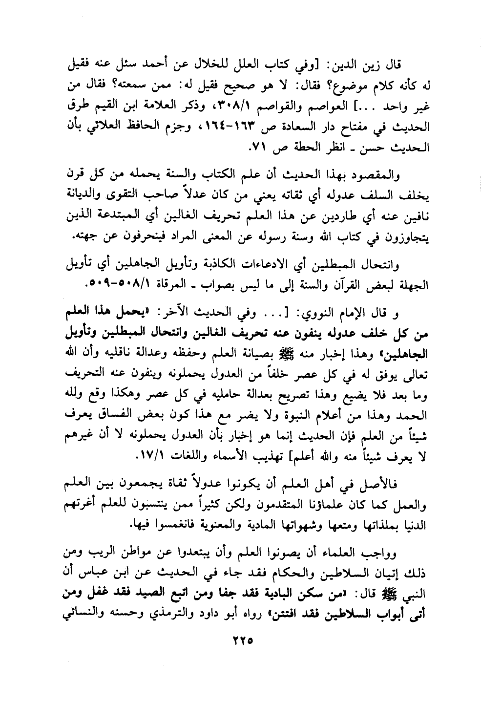وانتحال المبطلين أي الادعاءات الكاذبة وتأويل الجاهلين أي تأويل الجهلة لبعض القرآن والسنة إلى ما ليس بصواب. المرقاة 1/ 508 - 509.