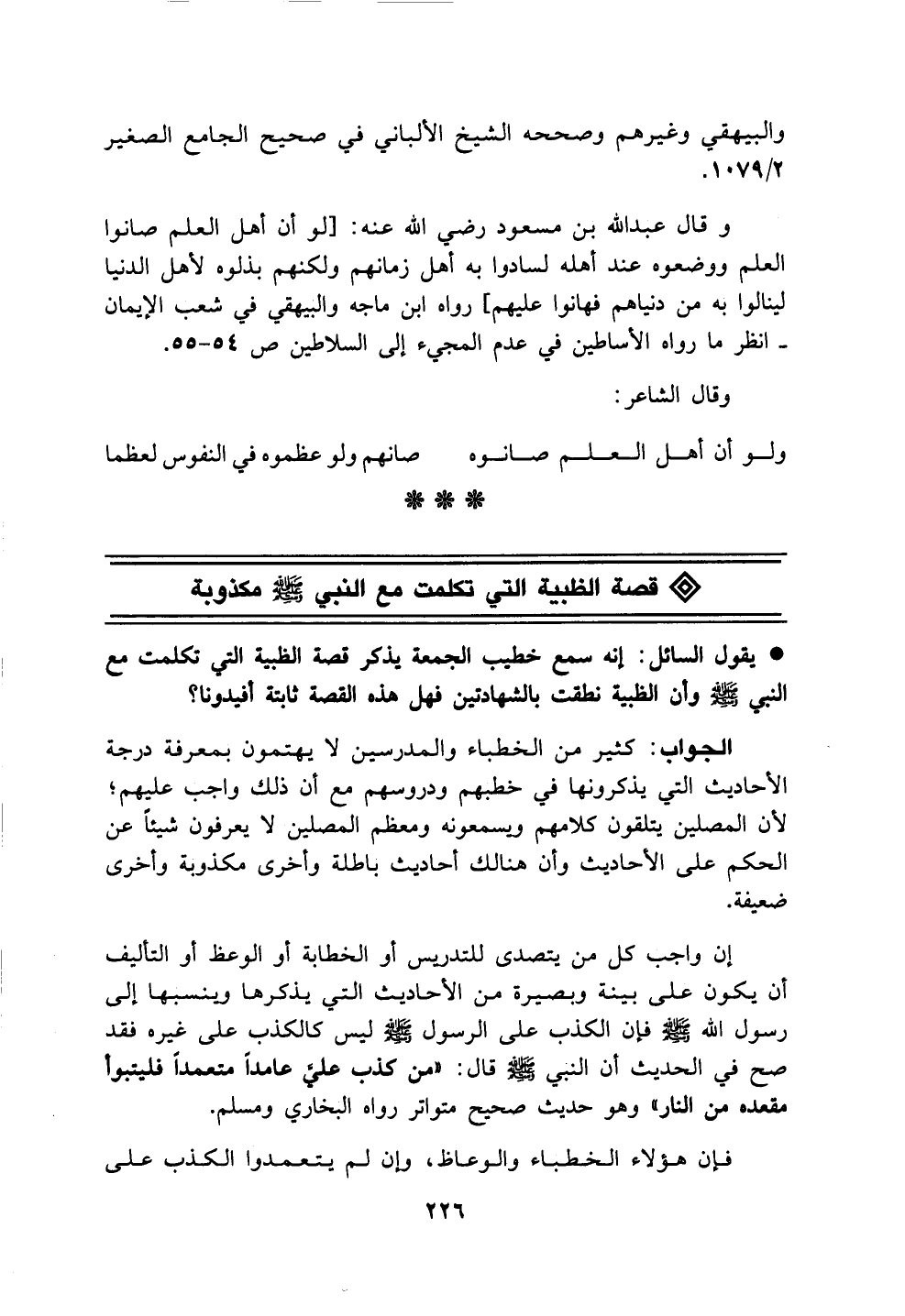 إن واجب كل من يتصدى للتدريس أو الخطابة أو الوعظ أو التأليف أن يكون على بينة وبصيرة من الأحاديث التي يذكرها وينسبها إلى رسول الله - صلى الله عليه وسلم - فإن الكذب على الرسول - صلى الله عليه وسلم - ليس كالكذب على غيره فقد صح في الحديث أن النبي - صلى الله عليه وسلم - قال: (من كذب عليَّ عامداً متعمداً فليتبوأ مقعده من النار) وهو حديث صحيح متواتر رواه البخاري ومسلم.