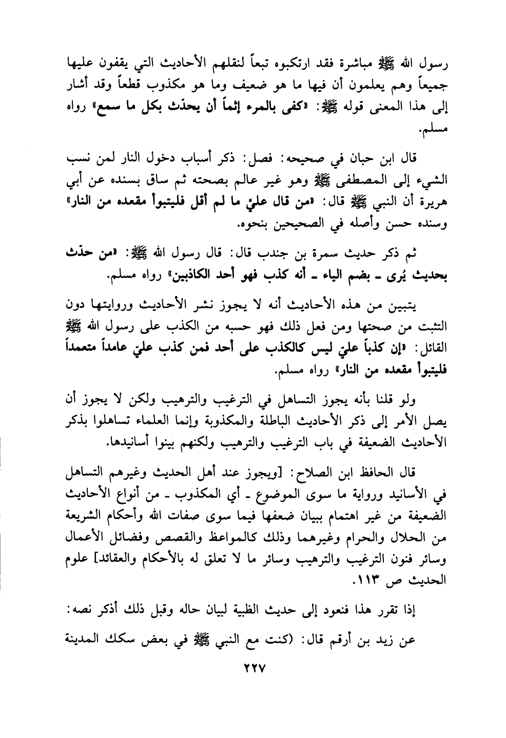 رسول الله - صلى الله عليه وسلم - مباشرة فقد ارتكبوه تبعاً لنقلهم الأحاديث التي يقفون عليها جميعاً وهم يعلمون أن فيها ما هو ضعيف وما هو مكذوب قطعاً وقد أشار إلى هذا المعنى قوله - صلى الله عليه وسلم -: (كفى بالمرء إثماً أن يحدّث بكل ما سمع) رواه مسلم.