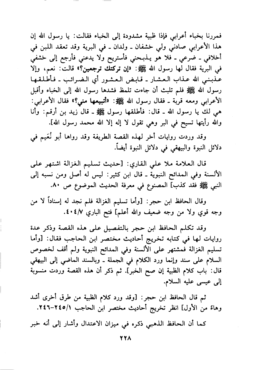 ثم قال الحافظ ابن حجر: [وقد ورد كلام الظبية من طرق أخرى أشد وهاءً من الأول] انظر تخريج أحاديث مختصر ابن الحاجب 1/ 245 - 246.