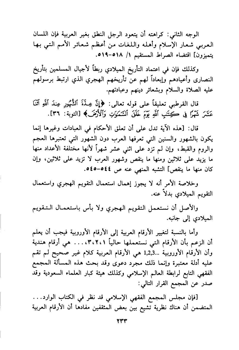 قال: [هذه الآية تدل على أن تعلق الأحكام في العبادات وغيرها إنما يكون بالشهور والسنين التي تعرفها العرب دون الشهور التي تعتبرها العجم والروم والقبط وإن لم تزد على اثني عشر شهراً لأنها مختلفة الأعداد منها ما يزيد على ثلاثين ومنها ما ينقص وشهور العرب لا تزيد على ثلاثين وإن كان منها ما ينقص] التشبه المنهي عنه ص 544 - 545.