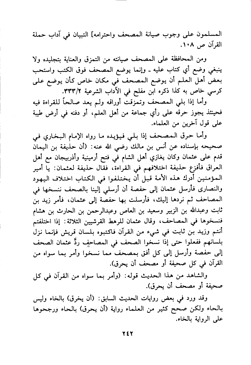 وأما حرق المصحف إذا بلي فيؤيده ما رواه الإمام البخاري في صحيحه بإسناده عن أنس بن مالك - رضي الله عنه -: (أن حذيفة بن اليمان قدم على عثمان وكان يغازي أهل الشام في فتح أرمينية وأذربيجان مع أهل العراق فأفزع حذيفة اختلافهم في القراءة، فقال حذيفة لعثمان: يا أمير المؤمنين أدرك هذه الأمة قبل أن يختلفوا في الكتاب اختلاف اليهود والنصارى فأرسل عثمان إلى حفصة أن أرسلي إلينا بالصحف ننسخها في المصاحف ثم نردها إليك، فأرسلت بها حفصة إلى عثمان، فأمر زيد بن ثابت وعبد الله بن الزبير وسعيد بن العاص وعبد الرحمن بن الحارث بن هشام فنسخوها في المصاحف وقال عثمان للرهط القرشيين الثلاثة، إذا اختلفتم أنتم وزيد بن ثابت في شيء من القرآن فاكتبوه بلسان قريش فإنما نزل بلسانهم ففعلوا حتى إذا نسخوا الصحف في المصاحف ردَّ عثمان الصحف إلى حفصة وأرسل إلى كل أفق بمصحف مما نسخوا وأمر بما سواه من القرآن في كل صحيفة أو مصحف أن يحرق).