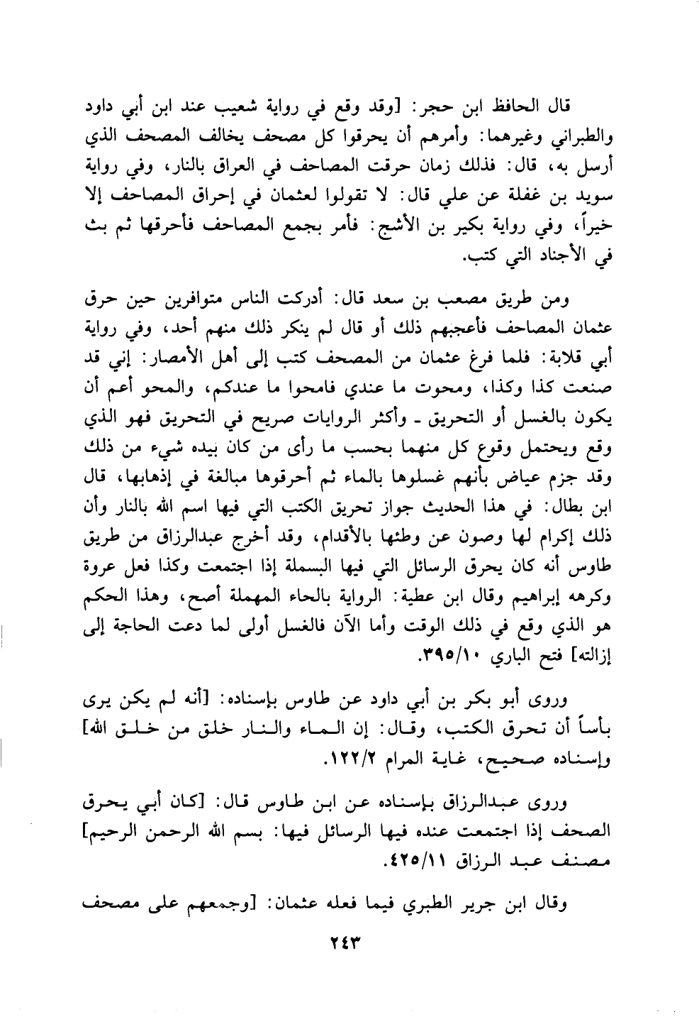 ومن طريق مصعب بن سعد قال: أدركت الناس متوافرين حين حرق عثمان المصاحف فأعجبهم ذلك أو قال لم ينكر ذلك منهم أحد، وفي رواية أبي قلابة: فلما فرغ عثمان من المصحف كتب إلى أهل الأمصار: إني قد صنعت كذا وكذا، ومحوت ما عندي فامحوا ما عندكم، والمحو أعم أن يكون بالغسل أو التحريق. وأكثر الروايات صريح في التحريق فهو الذي وقع ويحتمل وقوع كل منهما بحسب ما رأى من كان بيده شيء من ذلك وقد جزم عياض بأنهم غسلوها بالماء ثم أحرقوها مبالغة في إذهابها، قال ابن بطال: في هذا الحديث جواز تحريق الكتب التي فيها اسم الله بالنار وأن ذلك إكرام لها وصون عن وطئها بالأقدام، وقد أخرج عبد الرزاق من طريق طاووس أنه كان يحرق الرسائل التي فيها البسملة إذا اجتمعت وكذا فعل عروة وكرهه إبراهيم وقال ابن عطية: الرواية بالحاء المهملة أصح، وهذا الحكم هو الذي وقع في ذلك الوقت وأما الآن فالغسل أولى لما دعت الحاجة إلى إزالته] فتح الباري 10/ 395.