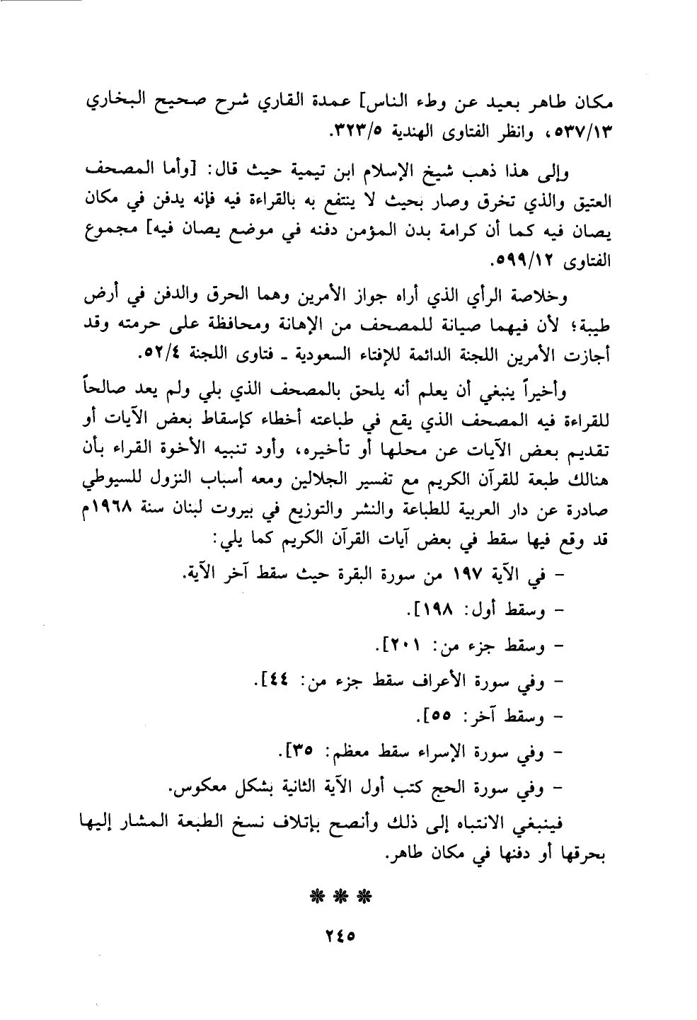 وخلاصة الرأي الذي أراه جواز الأمرين وهما الحرق والدفن في أرض طيبة لأن فيهما صيانة للمصحف من الإهانة ومحافظة على حرمته وقد أجازت الأمرين اللجنة الدائمة للإفتاء السعودية. فتاوى اللجنة 4/ 52.