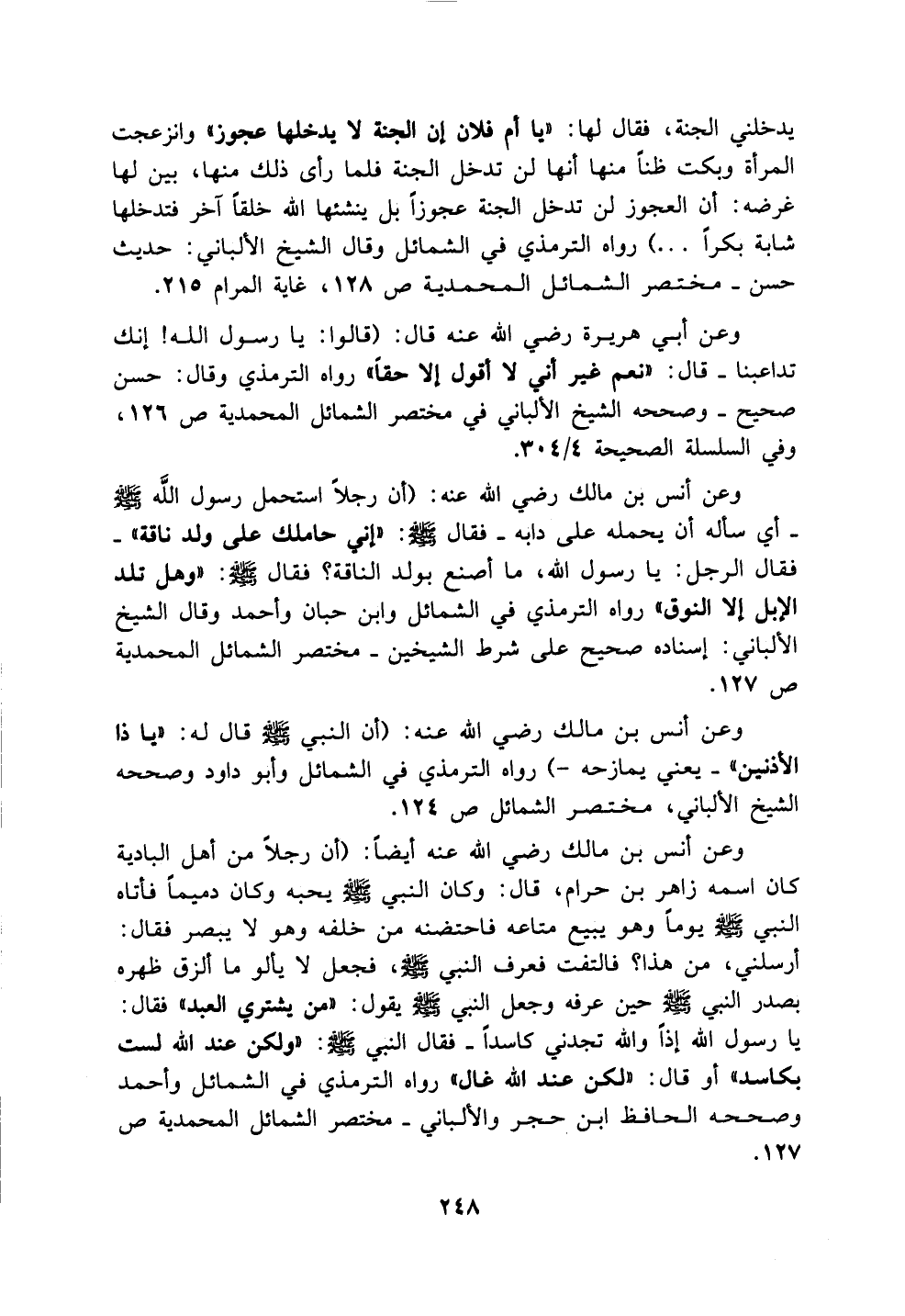 يدخلني الجنة، فقال لها: يا أم فلان إن الجنة لا يدخلها عجوز. وانزعجت المرأة وبكت ظناً منها أنها لن تدخل الجنة فلما رأى ذلك منها، بين لها غرضه: أن العجوز لن تدخل الجنة عجوزاً بل ينشئها الله خلقاً آخر فتدخلها شابة بكراً ... ) رواه الترمذي في الشمائل وقال الشيخ الألباني حديث حسن. مختصر الشمائل المحمدية ص 128، غاية المرام 215.