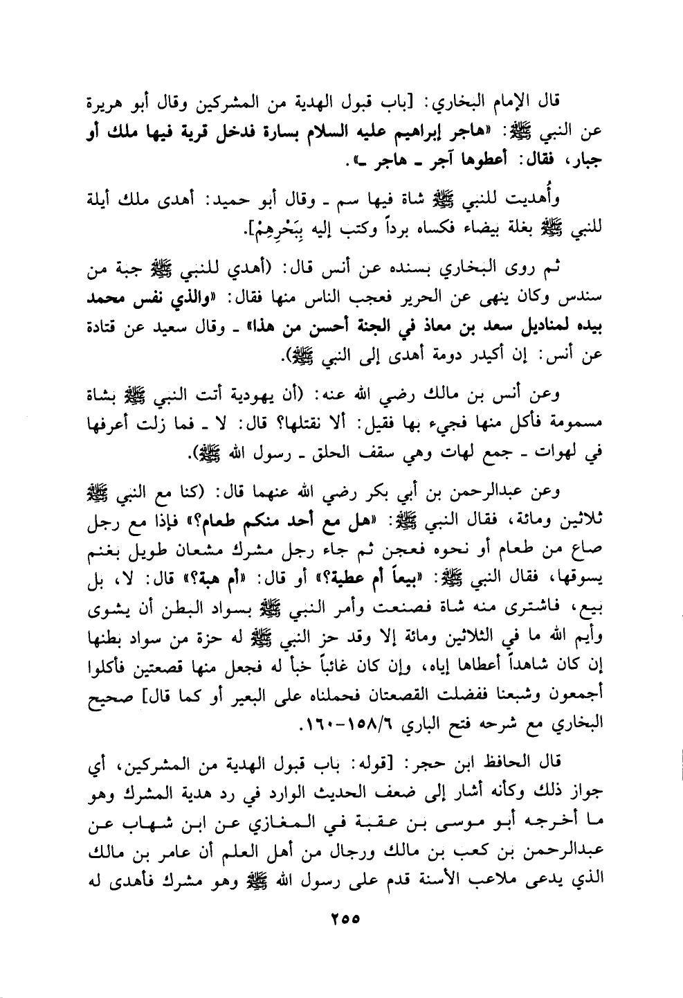 قال الإمام البخاري: [" باب قبول الهدية من المشركين " وقال أبو هريرة عن النبي - صلى الله عليه وسلم - هاجر ابراهيم عليه السلام بسارة فدخل قرية فيها ملك أو جبار، فقال: أعطوها آجر - هاجر -.
