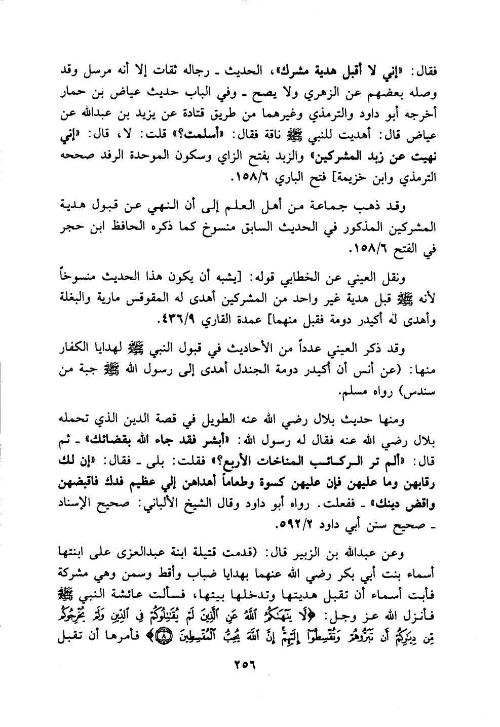 ونقل العيني عن الخطابي قوله: [يشبه أن يكون هذا الحديث منسوخاً لأنه - صلى الله عليه وسلم - قبل هدية غير واحد من المشركين أهدى له المقوقس مارية والبغلة وأهدى له أكيدر دومة فقبل منهما] عمدة القاري 9/ 436.