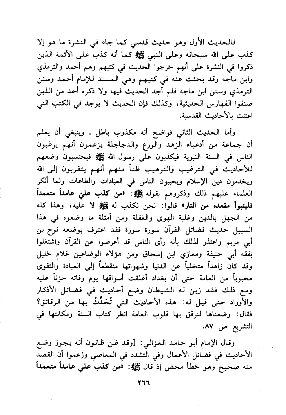 وقال الإمام أبو حامد الغزالي: [وقد ظن ظانون أنه يجوز وضع الأحاديث في فضائل الأعمال وفي التشدد في المعاصي وزعموا أن القصد منه صحيح وهو خطأ محض إذ قال - صلى الله عليه وسلم -: (من كذب علي عامداً متعمداً