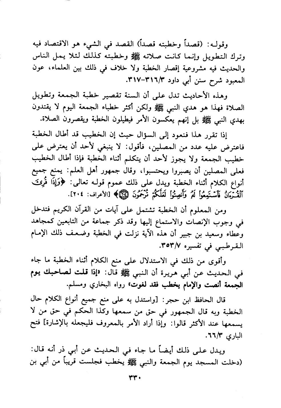 وأقوى من ذلك في الاستدلال على منع الكلام أثناء الخطبة ما جاء في الحديث عن أبي هريرة أن النبي - صلى الله عليه وسلم - قال: (إذا قلت لصاحبك يوم الجمعة أنصت والإمام يخطب فقد لغوت) رواه البخاري ومسلم.
