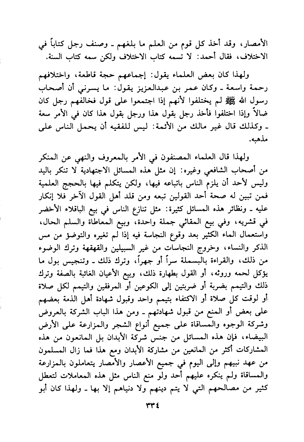 ولهذا قال العلماء المصنفون في الأمر بالمعروف والنهي عن المنكر من أصحاب الشافعي وغيره: إن مثل هذه المسائل الاجتهادية لا تنكر باليد وليس لأحد أن يلزم الناس باتباعه فيها، ولكن يتكلم فيها بالحجج العلمية فمن تبين له صحة أحد القولين تبعه ومن قلد أهل القول الآخر فلا إنكار عليه. ونظائر هذه المسائل كثيرة: مثل تنازع الناس في بيع الباقلاء الأخضر في قشريه، وفي بيع المقاثي جملة واحدة، وبيع المعاطاة والسلم الحال، واستعمال الماء الكثير بعد وقوع النجاسة فيه إذا لم تغيره والتوضؤ من مس الذكر والنساء، وخروج النجاسات من غير السبيلين والقهقهة وترك الوضوء من ذلك، والقراءة بالبسملة سراً أو جهراً، وترك ذلك. وتنجيس بول ما يؤكل لحمه وروثه، أو القول بطهارة ذلك، وبيع الأعيان الغائبة بالصفة وترك ذلك والتيمم بضربة أو ضربتين إلى الكوعين أو المرفقين والتيمم لكل صلاة أو لوقت كل صلاة أو الاكتفاء بتيمم واحد وقبول شهادة أهل الذمة بعضهم على بعض أو المنع من قبول شهادتهم. ومن هذا الباب الشركة بالعروض وشركة الوجوه والمساقاة على جميع أنواع الشجر والمزارعة على الأرض البيضاء، فإن هذه المسائل من جنس شركة الأبدان بل المانعون من هذه المشاركات أكثر من المانعين من مشاركة الأبدان ومع هذا فما زال المسلمون من عهد نبيهم وإلى اليوم في جميع الأعصار والأمصار يتعاملون بالمزارعة والمساقاة ولم ينكره عليهم أحد ولو منع الناس مثل هذه المعاملات لتعطل كثير من مصالحهم التي لا يتم دينهم ولا دنياهم إلا بها. ولهذا كان أبو