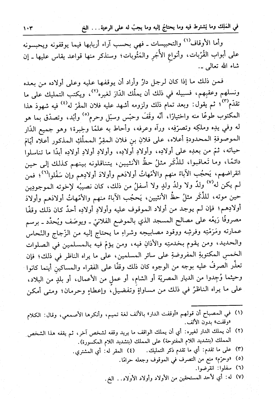 وأما الأوقاف والتحبيسات - فهي بحسب آراء أربابها فيما يوقفونه ويحبسونه على أبواب القرابات ، وأنواع الأجر والمثوبات ، وسنذكر منها قواعد يقاس عليها - إن شاء الله تعالى - . فمن ذلك ما إذا كان لرجل دار وأراد أن يوقفها عليه وعلى أولاده من بعده ونسلهم وعقبهم ، فسبيله في ذلك أن يملك الدار لغيره ، ويكتب التمليك على ما تقدم ، ثم يقول : وبعد تمام ذلك ولزومه أشهد عليه فلان المقر له فيه شهود هذا المكتوب وطوعاً منه واختياراً ، أنه وقف وحبس وسبل وحرم وأبد ، وتصدق بما هو له وفي يده وملكه وتصرفه ، ورآه عرفه ، وأحاط به علماً وخبرة ، وهو جميع الدار الموصوفة المحدودة أعلاه ، علا فلان بن فلان المقر المملك المذكور أعلاه أيام حياته ، ثم من بعده على أولاده ، وأولاد أولاده ، وأولاد أولاد أولاده أبداً ما تناسلوا دائماً ، وما تعاقبوا ، للذكر مثل حظ الأنثيين ، يتناقلونه بينهم كذلك إلى حين انقراضهم ، يحجب الآباء منهم والأمهات أولادهم وأولاد أولادهم وإن سفلوا ، فإن لم يكن له ولد ولا ولد ولد ولا أسفل من ذلك ، كان نصيبه لإخوته الموجودين حين موته ، للذكر مثل حظ الأنثيين ، يحجب الآباء منهم والأمهات أولادهم وأولاد أولادهم ، فإن لم يوجد من أولاد الموقوف عليه وأولاد أولاده أحد كان ذلك وقفاً مصروفاً ريعه على مصالح المسجد الذي بالموضع الفلاني - ويوصف ويحدد - برسم عمارته ومرمته وفرشه ووقود مصابيحه وشراء ما يحتاج إليه من الزجاج والنحاس والحديد ، ومن يقوم بخدمته والأذان فيه ، ومن يؤم فيه بالمسلمين في الصلوات الخمس المكتوبة المفروضة على سائر المسلمين ، على ما يراه الناظر في ذلك ، فإن تعذر الصرف عليه بوجه من الوجوه كان ذلك وقفاً على الفقراء والمساكين أينما كانوا وحيثما وجدوا من الديار المصرية أو الشأم ، أو عمل من الأعمال ، أو بلد من البلاد ، على ما يراه الناظر في ذلك من مساواة وتفضيل ، وإعطاءٍ وحرمان ، ومتى أمكن