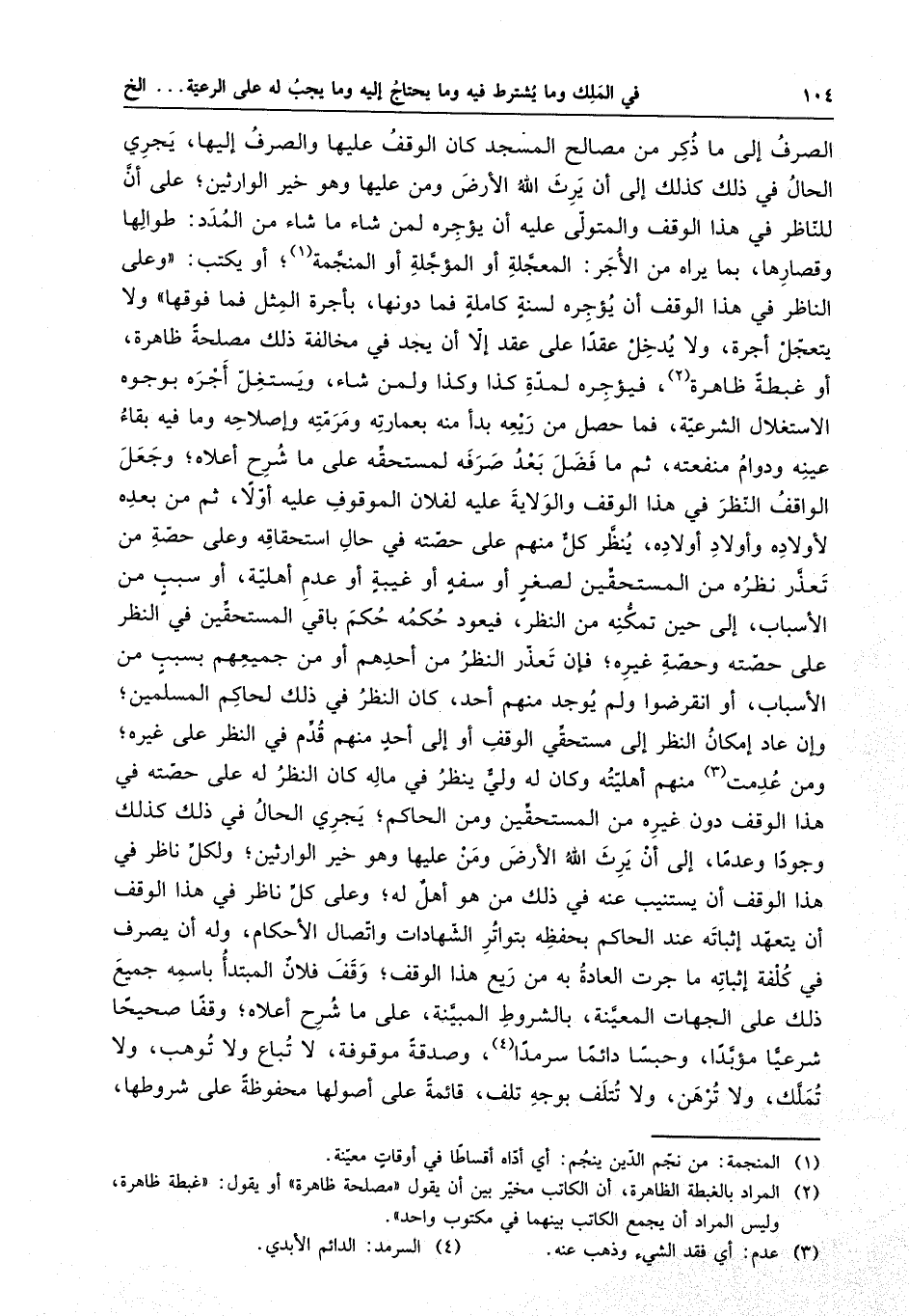 الصرف إلى ما ذكر من مصالح المسجد كان الوقف عليها والصرف إليها ، يجري الحال في ذلك كذلك إلى أن يرث الله الأرض ومن عليها وهو خير الوارثين ، على أن للناظر في هذا الوقف والمتولى عليه أن يؤجره لمن شاء ما شاء من المدد : طوالها وقصارها ، بما يراه من الأجر : المعجلة أو المؤجلة أو المنجمة ، أو يكتب : " وعلى الناظر في هذا الوقف أن يؤجره لسنة كاملة فما دونها ، بأجرة المثل فما فوقها ولا يتعجل أجرة ، ولا يدخل عقداً على عقد إلا أن يجد في مخالفة ذلك مصلحة ظاهرة ، أو غبطة ظاهرة ، فيؤجره لمدة كذا وكذا ولمن شاء ، ويستغل أجره بوجوه الاستغلال الشرعية ، فما حصل من ربعه بدأ منه بعمارته ومرمته وإصلاحه وما فيه بقاء عينه ودوام منفعته ، ثم ما فضل بعد صرفه لمستحقه على ما شرح أعلاه ، وجعل الوقف النظر في هذا الوقف والولاية عليه لفلان الموقوف عليه أولاً ، ثم من بعده لأولاده وأولاد أولاده ، ينظر كل منهم على حصته في حال استحقاقه وعلى حصة من تعذر نظره من المستحقين لصغير أو سفهٍ أو عيبةٍ أو عدم أهلية ، أو سبب من الأسباب ، إلى حين تمكنه من النظر ، فيعود حكمه حكم باقي المستحقين في النظر على حصته وحصة غيره ، فإن تعذر النظر من أحدهم أو من جميعهم بسبب من الأسباب ، أو انقرضوا ولم يوجد منهم أحد ، كان النظر في ذلك لحاكم المسلمين ، وإن عاد إمكان النظر إلى مستحقي الوقف أو إلى أحد منهم قدم في النظر على غيره ، ومن عدمت منهم أهليته وكان له من ولي ينظر في ماله كان النظر له على حصته في هذا الوقف دون غيره من المستحقين ومن الحاكم ، يجرى الحال في ذلك كذلك وجود وعدما ، إلى أن يرث الله الأرض ومن عليها وهو خير الوارثين ، ولكل ناظر في هذا الوقف أن يستنيب عنه في ذلك من هو أهل له ، وعلى كل ناظر في هذا الوقف أن يتعهد إثباته عند الحاكم بحفظه بتواتر الشهادات واتصال الأحكام ، وله أن يصرف في كلفة إثباته ما جرت العادة به من ريع هذا الوقف ، وقف فلان المبتدأ باسمه جميع ذلك على الجهات المعينة ، بالشروط المبينة ، على ما شرح أعلاه ، وقفاً صحيحاً شرعياً مؤبدا ، وحبساً دائماً سرمداً ، وصدقة موقوفة ، لا تباع ولا توهب ، ولا تملك ، ولا ترهن ، ولا تتلف بوجه تلف ، قائمة على أصولها محفوظة على شروطها ،