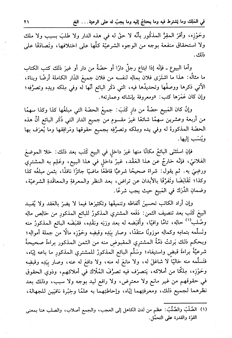 فإن استثنى البائع مكاناً منها غير داخل في البيع كتب بعد ذلك : خلا الموضع الفلاني ، فإنه خراج عن هذا العقد ، غير داخل في هذا البيع ، وعلم به المشتري ورضى به . ثم يقول : شراءً صحيحاً قاطعاً ماضياً جائزاً نافذاً بثمن مبلغه كذا وكذا ، تقابضاً وتفرقاً بالأبدان عن تراض ، بعد النظر والمعرفة والمعاقدة الشرعية ، وضمان الدرك في المبيع حيث يجب شرعاً . وإن أراد الكاتب تحسني ألفاظه وتنميقها وتكثيرها فيما لا يضر بالعقد ولا يفسد البيع كتب بعد تنصيف الثمن : دفعه المشتري المذكور للبائع المذكور من خالص ماله وصلب حاله ، تاماً وافياً ، وأقبضه له بعد وزنه ونقده ، فقبضه البائع المذكور منه وتسلمه بتمامه وكماله موزوناً منتقداً ، وصار بيده وقبضه وحوزه مالاً من جملة أمواله ، وبحكم ذلك برئت ذمة المشتري المقبوض منه من الثمن المذكور براءة صحيحة شرعية براءة قبض واستيفاء ، وسلم البائع المذكور للمشتري المذكور ما باعه إياه ، فتسلمه منه خالياً لا شاغل له ، ولا مانع له منه ، ولا دافع له عنه ، وصار بيده وقبضه وحوزه ، ملكاً من أملاكه ، يتصرف فيه تصرف الملاك في أملاكه ، وذوي الحقوق في حقوقهم من غير مانع ولا معترض ، ولا رافع ليد بوجه ولا سبب ، وذلك بعد نظرهما لجميع ذلك ، ومعرفتها إياه ، وإحاطتهما به علماً وخبرة نافيين للجهالة ،