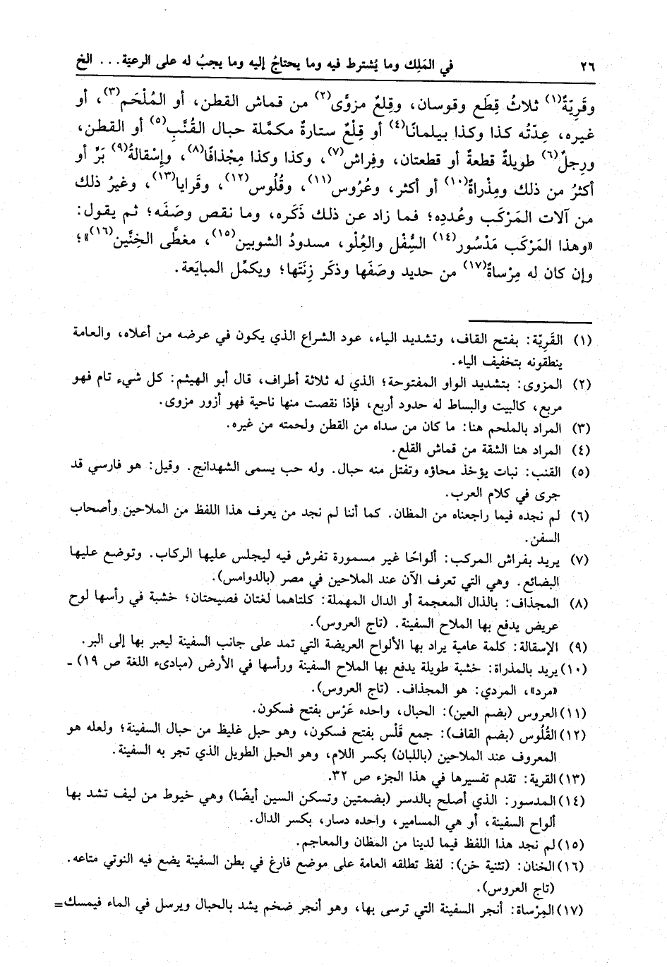 وقرية ثلاث قطع وقوسان ، وقلع مزوى من قماش القطن ، أو الملحم ، أو غيره ، عدته كذا وكذا بيلمانا أو قلع ستارة مكملة حبال القنب أو القطن ، ورجل طويلة قطعة أو قطعتان ، وفراش ، وكذا وكذا مجذافاً ، وإسقالة بئر أو أكثر من ذلك ومذراة أو أكثر ، وعروس ، وقلوس ، وقرايا ، وغير ذلك من آلات المركب وعدده ، فما زاد عن ذلك ذكره ، وما نقص وصفه ، ثم يقال : وهذا المركب مدسور السفل والعلو ، مسدود الشوبين ، مغطى الحنين ، وإن كان له مرساة من حديد وصفها وذكر زنتها ، ويكمل المبايعة .