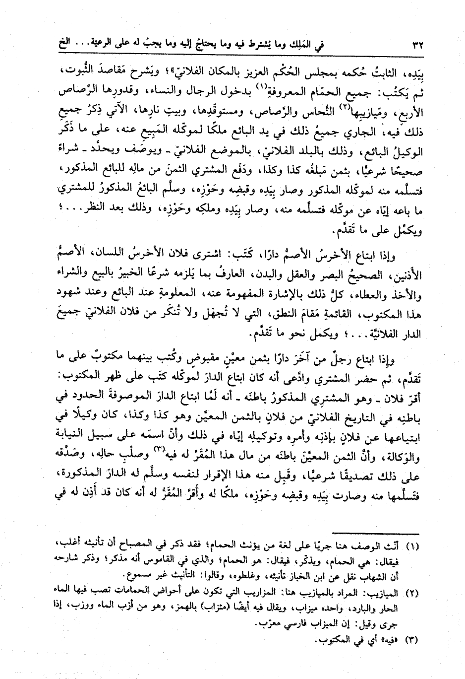 بيده ، الثابت حكمه بمجلس الحكم العزيز بالمكان الفلاني ، ويشرح مقاصد الثبوت ، ثم يكتب : جميع الحمام المعروفة بدخول الرجال والنساء ، وقدروا الرصاص الأربع ، وميزايبها النحاس والرصاص ، ومستوقدها ، وبيت نارها ، الآتي ذكر جميع ذلك فيه ، الجاري جميع ذلك في البائع ملكاً لموكله المبيع عنه ، على ما ذكر الوكيل البائع ، وذلك بالبلد الفلاني ، بالموضع الفلاني - ويوصف ويحدد شراء صحيحاً شرعياً ، بثمن مبلغه كذا كذا ، ودفع المشتري الثمن من ماله للبائع المذكور ، فتسلمه منه لموكله المذكور وصار بيده وقبضه وحوزه ، وسلم البائع المذكور للمشتري ما باعه إياه عن موكله فتسلمه منه ، وصار بيده وملكه وحوزه ، وذلك بعد النظر . . . ، ويكمل على ما تقدم .