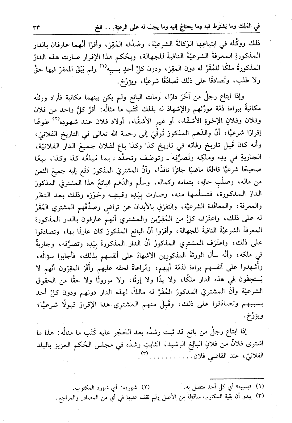وإذا ابتاع رجل من آخر داراً ، ومات البائع ولم يكن بينهما مكاتبة فأراد ورثته مكاتبة ببراءة ذمة مورثهم والإشهاد له بذلك ، كتب ما مثاله : أقر كل واحد من فلان وفلان وفلان الإخوة الأشقاء ، أو غير الأشقاء ، أولاد فلان عند شهوده طوعاً إقرار شرعياً أن والدهم المذكور توفي إلى رحمة الله تعالى في التاريخ الفلاني ، وأنه كان قبل تاريخ وفاته في تاريخ كذا وكذا باع لفلان جميع الدار الفلانية ، الجارية في يده وملكه وتصرفه - وتوصف وتحدد - بما مبلغه كذا وكذا ، بيعاً صحيحاً شرعياً قاطعاً ماضياً جائزاً نافذاً ، وأن المشتري المذكور دفع إليه جميع الثمن من ماله ، وصلب حاله ، بتمامه وكماله ، وسلم والدهم البائع هذا المشتري المذكور الدار المذكورة ، فتسلمها منه ، وصارت بيده وقبضه وحوزه وذلك بعد النظر والمعرفة ، والمعاقدة الشرعية ، والتفرق بالأبدان عن تراض وصدقهم المشتري المقر له على ذلك ، واعترف كل من المقرين والمشتري أنه عارفون بالدار المذكورة المعرفة الشرعية النافية للجهالة ، وأقروا أن البائع المذكور كان عارفاً بها ، وتصادقوا على ذلك ، واعترف المشتري المذكور أن الدار المذكورة بيده وتصرفه ، جارية في ملكه ، وأنه سأل الورثة المذكورين الإشهاد على أنفسهم بذلك ، فأجابوا سؤاله ، وأشهدوا على أنفسهم براءة لذمة أبيهم ، ومراعاةً لحقه عليهم وأقر المقترون أنهم لا يستحقون في هذه الدار ملكاً ، ولا يدا ، ولا إرثاً ، ولا موروثا ولا حقاً من الحقوق الشرعية ، وأن المشتري المذكور المقر له مالك لهذه الدار دونهم ودون كل أحد بسببهم ، وتصادقوا على ذلك ، وقبل منهم المشتري هذا الإقرار قبولاً شرعياً ، ويؤرخ . إذا ابتاع رجل من بائع قد ثبت رشده بعد الحجر عليه كتب ما مثاله : هذا ما اشترى فلا من فلان البالغ الرشيد ، الثابت رشده في مجلس الحكم العزيز بالبلد الفلاني ، عند القاضي فلان . . . . .