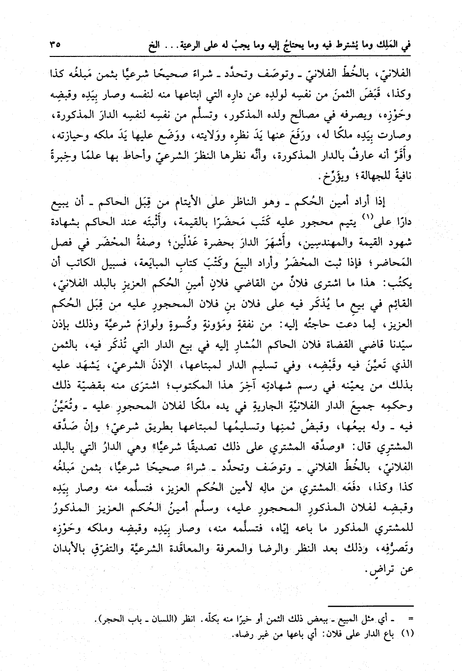إذا أراد أمين الحكم - وهو الناظر على الأيتام من قبل الحاكم - أن يبيع دارا على يتيم محجور عليه كتب محضراً بالقيمة ، وأثبته عند الحاكم بشهادة شهود القيمة والمهندسين ، وأشهر الدار بحضرة عدلين ، وصفه المحضر في فصل المحاضر ، فإذا ثبت المحضر وأراد البيع وكتب كتاب المبايعة ، فسبيل الكاتب إن يكتب : هذا ما اشترى فلان من القاضي فلان أمين الحكم العزيز بالبلد الفلاني ، القائم في بيع ما يذكر فيه على فلان بن فلان المحجور عليه من قبل الحكم العزيز ، لما دعت حاجته إليه : من نفقة ومؤونة وكسوة ولوازم شرعية ، وذلك بإذن سيدنا قاضي القضاة فلان الحاكم المشار إليه في بيع الدار التي تذكر فيه ، بالثمن الذي تعين فيه وقبضه ، وفي تسليم الدار لمبتاعها ، الإذن الشرعي ، يشهد عليه بذلك من يعينه في رسم شهادته آخر هذا المكتوب ، اشترى منه يقضيه ذلك وحكمه جميع الدار الفلانية الجارية في يده ملكاً لفلان المحجور عليه - وتعين فيه - وله بيعها ، وقبض ثمنها وتسليمها لمبتاعها بطريق شرعي ، وإن صدقة المشتري قال : وصدقه المشتري على ذلك تصديقاً شرعياً وهي الدار التي بالبلد الفلاني ، بالخط الفلاني - وتوصف وتحدد - شراء صحيحاً شرعياً ، بثمن مبلغه كذا وكذا ، دفعه المشتري من ماله لأمين الحكم العزيز ، فتسلمه منه وصار بيده وقبضه لفلان المذكور المحجور عليه ، وسلم أمين الحكم العزيز المذكور للمشتري ما باعه إياه ، فتسلمه منه ، وصارت بيده وقبضه وملكه وحوزه وتصرفه ، وذلك بعد النظر والرضا والمعرفة والمعاقدة الشرعية والتفرق بالأبدان عن تراض .
