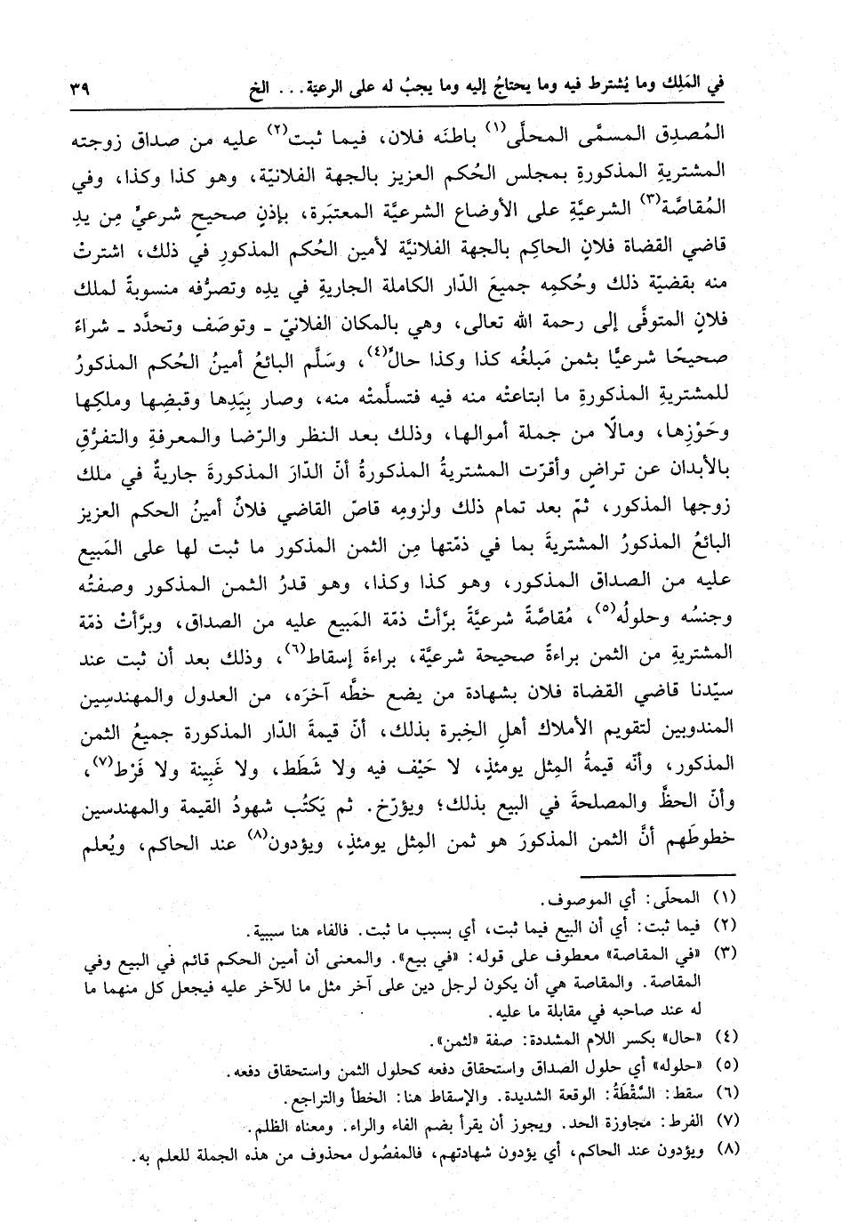 المصدق المسمى المحلى باطنه فلان ، فيما ثبت عليه من صداق زوجته المشترية المذكورة بمجلس الحكم العزيز بالجهة الفلانية ، وهو كذا وكذا ، وفي المقاصة الشرعية على الأوضاع المعتبرة ، بإذن صحيحٍ شرعي من يد قاضي القضاة فلان الحاكم بالجهة الفلانية لأمين الحكم المذكور في ذلك ، اشترت منه بقضية ذلك وحكمه جميع الدار الكاملة الجارية في يده وتصرفه منسوبة لملك فلان المتوفى إلى رحمة الله تعالى ، وهي بالمكان الفلاني - وتوصف وتحدد - شراء صحيحاً شرعياً بثمن مبلغه كذا وكذا حال ، وسلم البائع أمين الحكم المذكور للمشترية المذكورة ما ابتاعته منه فيه ، فتسلمته منه ، وصار بيدها وقبضها وملكها وحوزها ، ومالاً من جملة أموالها ، وذلك بعد النظر والرضا والمعرفة والتفرق بالأبدان عن تراض وأقرت المشترية المذكورة أن الدار المذكورة جارية في ملك زوجها المذكور ، ثم بعد ذلك ولزومه قاص القاضي فلان أمين الحكم العزيز البائع المذكور المشترية بما في ذمتها من الثمن المذكور ما ثبت لها على المبيع عليه من الصداق المذكور ، وهو كذا وكذا ، وهو قدر الثمن المذكور وصفته وجنسه وحلوله ، مقاصة شرعية برأت ما في ذمة المبيع عليه من الصداق ، وبرأت ما في ذمته المشترية من الثمن براءة صحيحة شرعية ، براءة إسقاط ، وذلك بعد أن ثبت عند سيدنا قاضي القضاة فلان بشهادة من يضع خطه آخره ، من العدول والمهندسين المندوبين لتقويم الأملاك أهل الخبرة بذلك ، أن قيمة الدار المذكورة جميع الثمن المذكور ، وأنه قيمة المثل يومئذ ، لا حيف فيه ولا شطط ، ولا غبينة ولا فرط ، وأن الحظ والمصلحة في البيع بذلك ، ويؤرخ . ثم يكتب شهود القيمة والمهندسين خطوطهم أن الثمن المذكور هو ثمن المثل يومئذ ، ويؤدون عند الحاكم ، ويعلم
