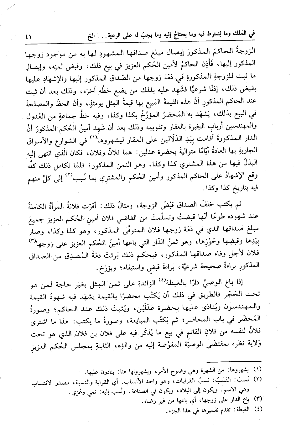 ثم يكتب خلف الصداق قبض الزوجة ، ومثال ذلك : أقرت فلانة المرأة الكاملة عند شهوده طوعاً أنها قبضت وتسلمت من القاضي فلان أمين الحكم العزيز جميع مبلغ صداقها الذي في ذمة زوجها فلان المتوفى المذكور ، وهو كذا وكذا ، وصار بيدها وقبضها وحوزها ، وهو ثمن الدار التي باعها أمين الحكم العزيز على زوجها فلان لأجل وفاء صداقها المذكور ، فبحكم ذلك برئت ذمة المصدق من الصداق المذكور براءة صحيحة شرعية ، براءة قبض واستيفاء ، ويؤرخ . إذا باع الوصي دار بالغبطة الزائدة على ثمن المثل بغير حاجة لمن هو تحت الحجر فالطريق في ذلك أني كتب محضرا بالقيمة يشهد فيه شهود القيمة والمهندسون وينادي عليه بحضرة عدلين ، ويثبت ذلك عند الحاكم ، وصورة المحضر في باب المحضر ، ثم يكتب المبايعة ، وصورة ما يكتب : هذا ما اشترى فلان لنفسه من فلان القائم في بيع ما يذكر فيه على فلان بن فلان الذي هو تحت ولاية نظره بمقتضى الوصية المفوضة إليه من والده ، الثابتة بمجلس الحكم العزيز
