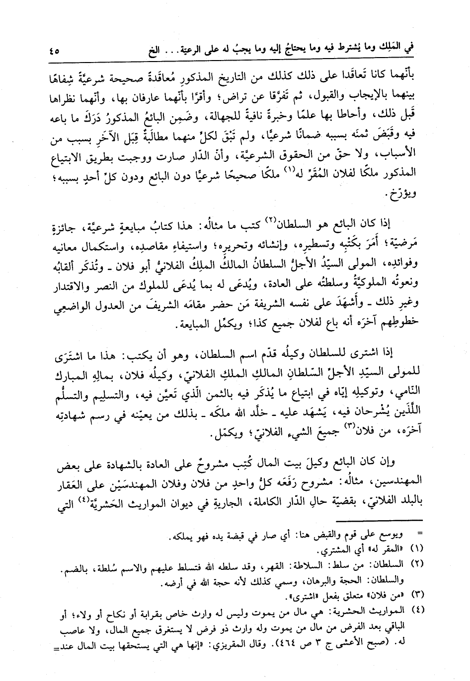إذا اشترى للسلطان وكيه قدم اسم السلطان ، وهو أن يكتب : هذا ما اشترى للمولى السيد الأجل السلطان المالك الملك الفلاني ، وكيله فلان ، بماله المبارك النامي ، وتوكيله إياه في ابتياع ما يذكر فيه بالثمن الذي تعين فيه ، والتسليم والتسلم اللذين يشرحان فيه ، يشهد عليه - خلد الله ملكه - بذلك من يعينه في رسم شهادته آخره ، من فلان جميع الشيء الفلاني ، ويكمل . وإن كان البائع وكيل بيت المال كتب مشروحٌ على العادة بالشهادة على بعض المهندسين ، مثلاه : مشروح رفعه كل واحد من فلان وفلان المهندسين على العقار بالبلد الفلاني ، بقضية حال الدار الكاملة ، الجارية في ديوان المواريث الحشرية التي