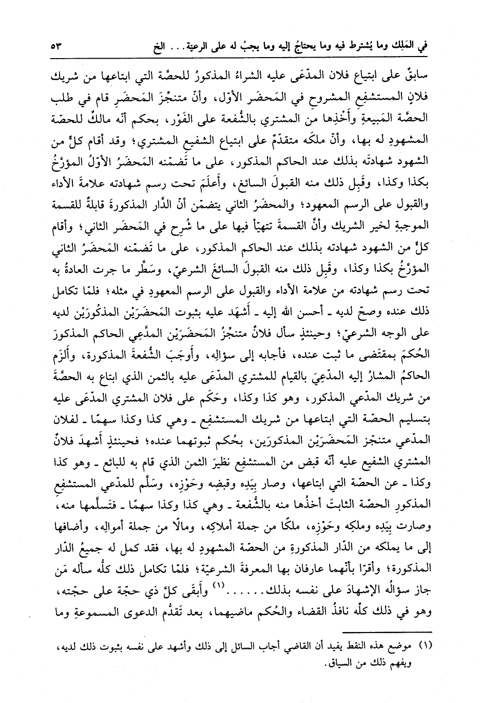 سابق على ابتياع فلان المدعي عليه الشراء المذكور للحصة التي ابتاعها من شريك فلان المستشفع المشروح في المحضر الأول ، وأن متنجز المحضر قام في طلب الحصة المبيعة وأخذها من المشتري بالشفعة على الفور ، بحكم أنه مالك للحصة المشهود له بها ، وأن ملكه متقدم على ابتياع الشفيع المشتري ، وقد أقام كل من الشهود شهادته بذلك عند الحاكم المذكور ، على ما تضمنه المحضر الأول المؤرخ بكذا وكذا ، وقبل ذلك منه القبول السائغ ، وأعلم تحت رسم شهادته علامة الأداء والقبول على الرسم المعهود ، والمحضر الثاني يتضمن أن الدار المذكورة قابلة للقسمة الموجبة لخير الشريك وأن القسمة تتهيأ فيها على ما شرح في المحضر الثاني ، وأقام كل من الشهود شهادته بذلك عند الحاكم المذكور ، على ما تضمنه المحضر الثاني المؤرخ بكذا وكذا ، وقبل ذلك منه القبول السائغ الشرعي ، وسطر ما جرت العادة به تحت رسم شهادته علامة الأداء والقبول على الرسم المعهود ، والمحضر الثاني يتضمن أن الدار المذكور قابلة للقسمة الموجبة لخير الشريك وأن القسمة تتهيأ فيها على ما شرح في المحضر الثاني ، وأقام كل من الشهود شهادته بذلك عند الحاكم المذكور ، على ما تضمنه المحضر الثاني المؤرخ بكذا وكذا ، وقبل ذلك منه القبول السائغ الشرعي ، وسطر ما جرت العادة به تحت رسم شهادته من علامة الأداء والقبول على الرسم المعهود في مثله ، فلما تكامل ذلك عنده وصح لديه - أحسن الله إليه - أشهد عليه بثبوت المحضرين المذكورين لديه على الوجه الشرعي ، وحينئذ سأل فلان متنجز المحضرين المدعي الحاكم المذكور الحكم بمقتضى ما ثبت عنده ، فأجابه إلى سؤاله ، وأوجب الشفعة المذكورة ، وألزم الحاكم المشار إليه المدعي بالقيام للمشتري المدعي عليه بالثمن الذي ابتاع به الحصة من شريك المدعي المذكور ، وهو كذا وكذا ، وحكم على فلان المشتري المدعي عليه بتسليم الحصة التي ابتاعها من شريك المستشفع - وهي كذا وكذا سهماً - لفلان المدعي متنجز المحضرين المذكورين ، بحكم ثبوتهما عنده ، فحينئذ أشهد فلان المشتري الشفيع عليه أنه قبض من المستشفع نظير الثمن الذي قام للبائع - وهو كذا وكذا - عن الحصة التي ابتاعها ، وصارت بيده وقبضه وحوزه ، وسلم للمدعي المستشفع المذكور الحصة الثابتة أخذها منه بالشفعة - وهي كذا وكذا سهماً - فتسلمها منه ، وصارت بيده وملكه وحوزه ، ملكاً من جملة أملاكه ، ومالا من جملة أمواله ، وأضافها إلى ما يملكه من الدار المذكورة من الحصة المشهود له بها ، وفقد كمل له جميع الدار المذكورة ، وأقر بأنهما عارفان بها المعرفة الشرعية ، فلما تكامل ذلك كله سأله من جاز سؤاله الإشهاد على نفسه بذلك . . . وأبقى كل ذي حجة على حجته ، وهو في ذلك كله نافذ القضاء والحكم ماضيهما ، بعد تقدم الدعوى المسموعة وما